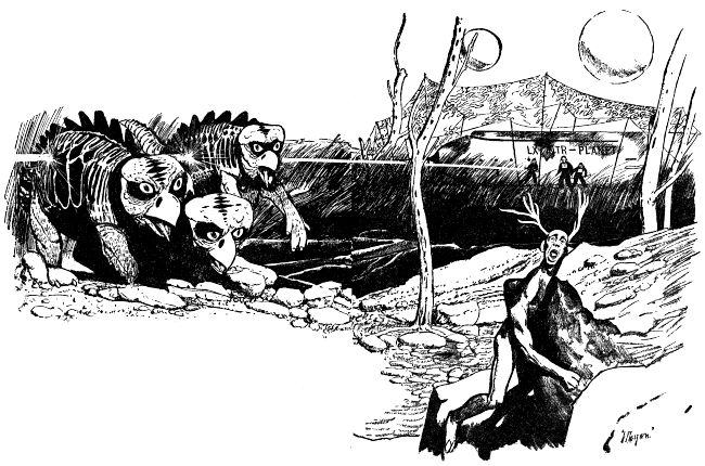 In the nose turret, two gun barrels continued their sweep. "Nope," came back Gordon's voice. "There's a broad prairie just beyond the trees on the 'East' side of this clearing, if you remember. Plain as day in this double moonlight. Almost looks like my home state, except for a few hills of that phosphorescent coral rock. Maybe—HEY! Some kind of critters running toward the hills! About five kilometers away. Flashes...." He broke off, as if absorbed in watching.