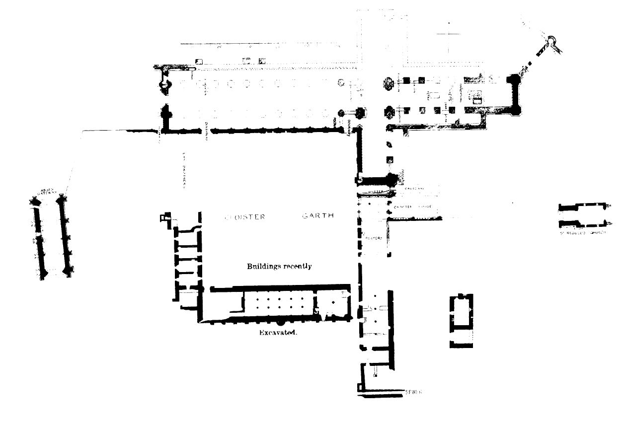 “He laid with a pleasing pavement the whole space not only of the choir, but also of the transept [transversarum capellarum] of the church, along with both sides [lateribus sive panis] of the cloister, and also the outer chapter house [inferius capitulum]. He rebuilt, as it were, from the foundations the fair and remarkable palace within the court of the prior’s lodging, along with the handsome [decentoribus] oratory and chamber which are there situated;{xvi} and likewise domestic manor-houses in their [or his ‘suis’] ‘locaperhendinalia’ [places where he might occasionally have to stay, perendie = the day after to-morrow], such as Ballon, Segy, and Kynmoth.”