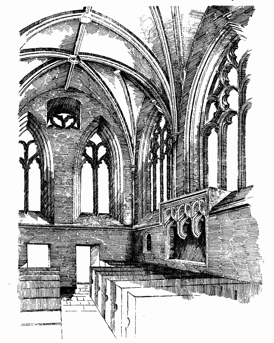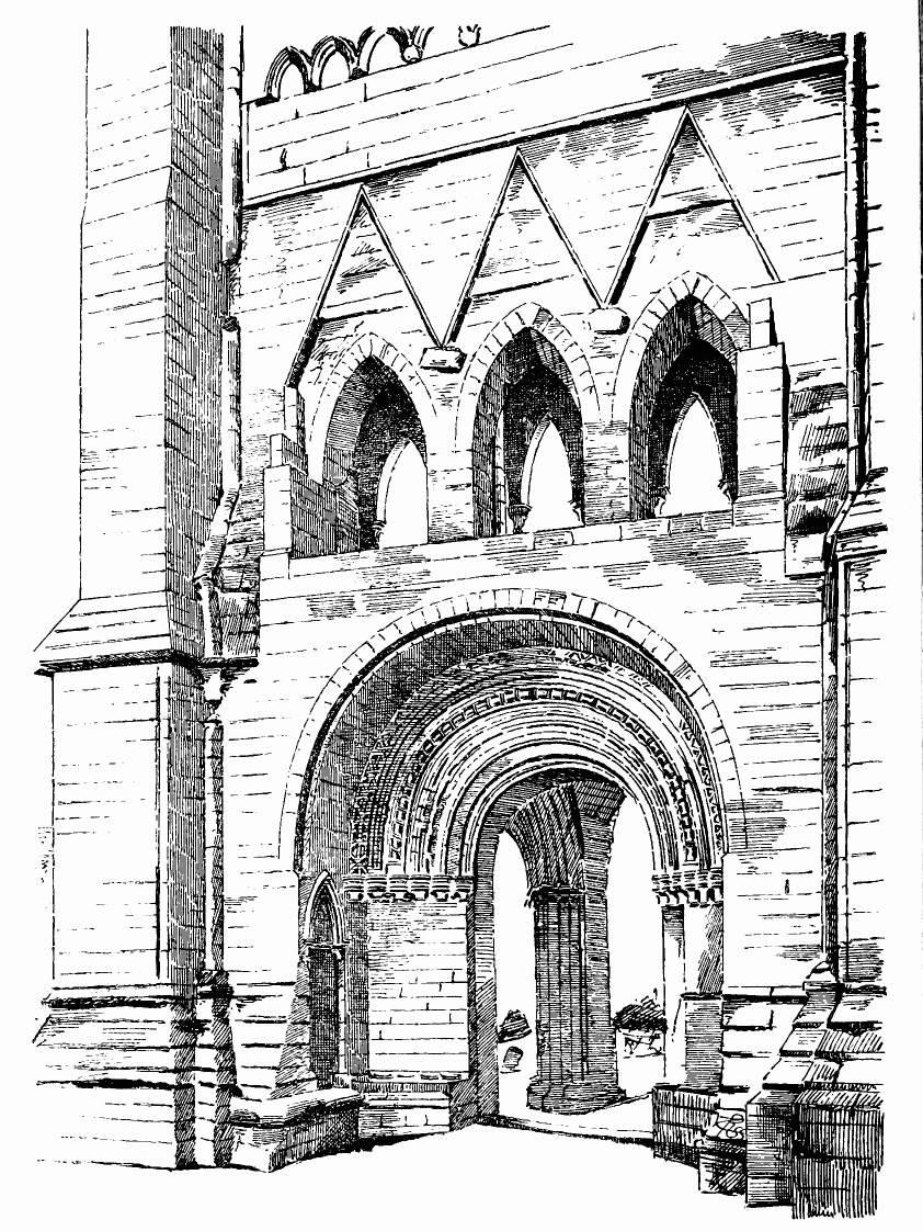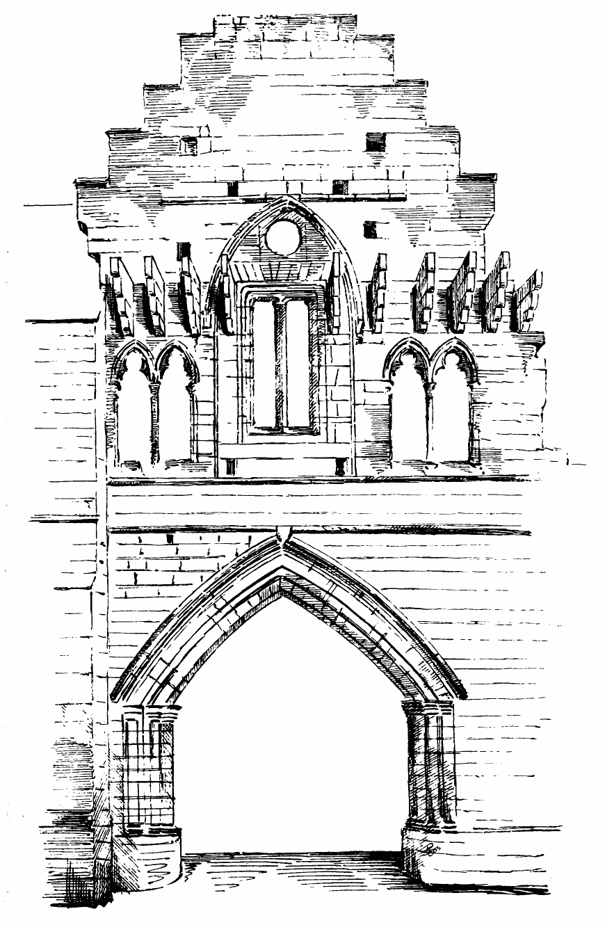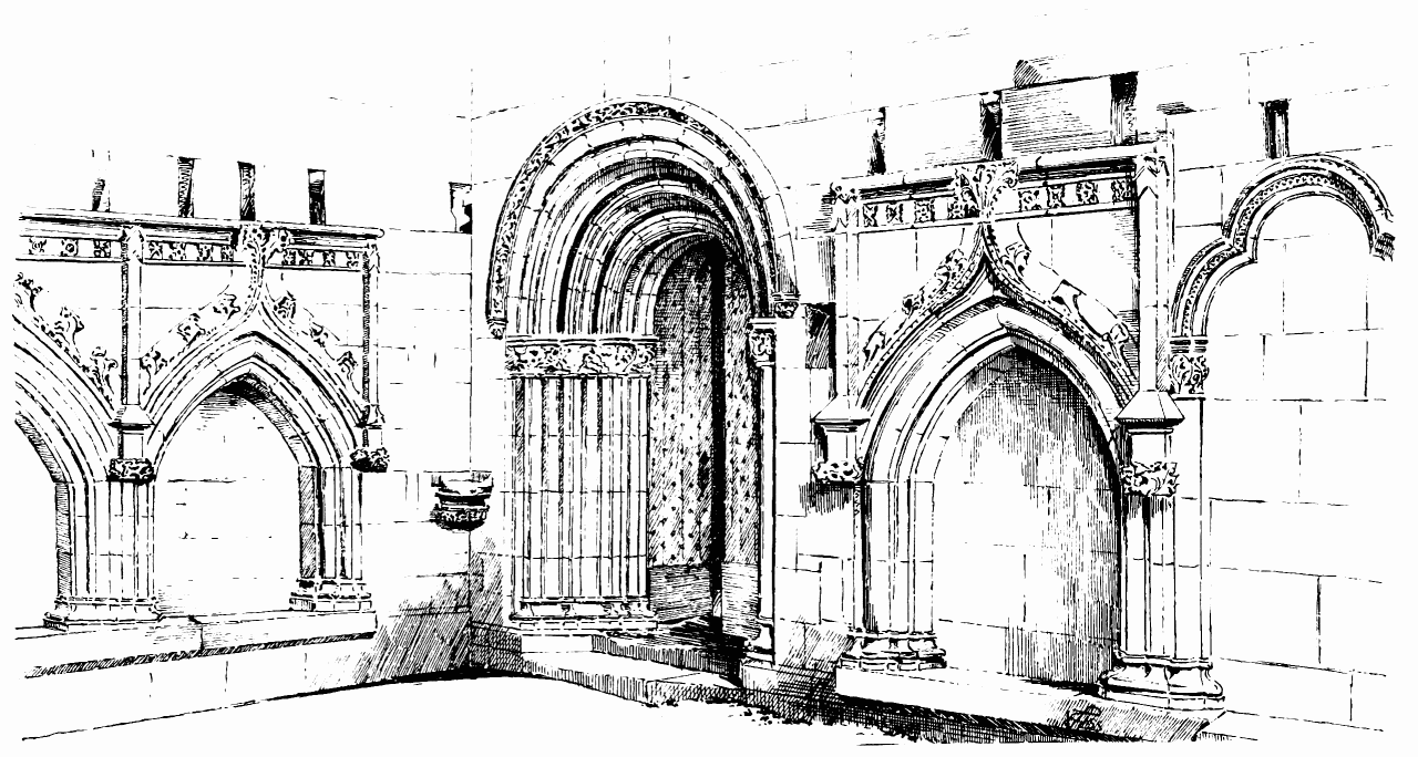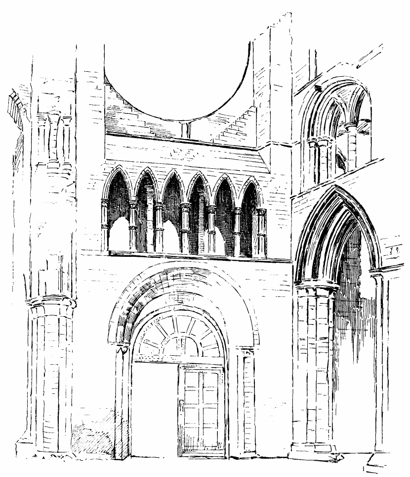 “He [Halderston] built the eastern gable from the foundations, along with its arch [arcuali voltâ].” As Lord Bute remarks—“This must mean only the east window, the greater part of the east wall being of transition work” (see Figs. 443-444.) “He adorned pleasingly the hinder vestry [revestiarium] with the reliques and other restorations and cases [clausaris] at considerable expense.”
