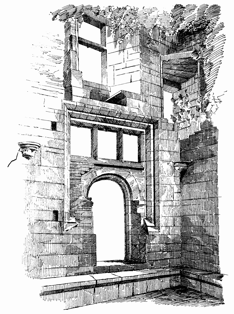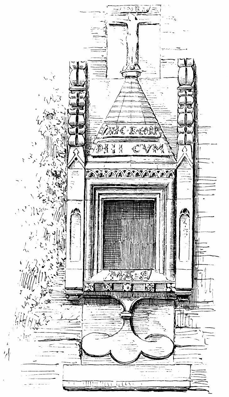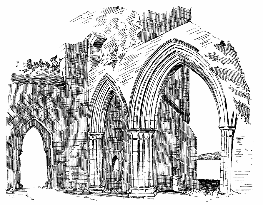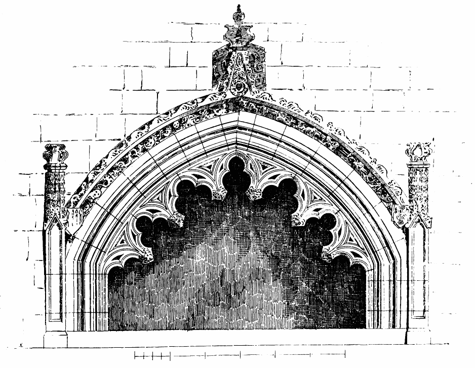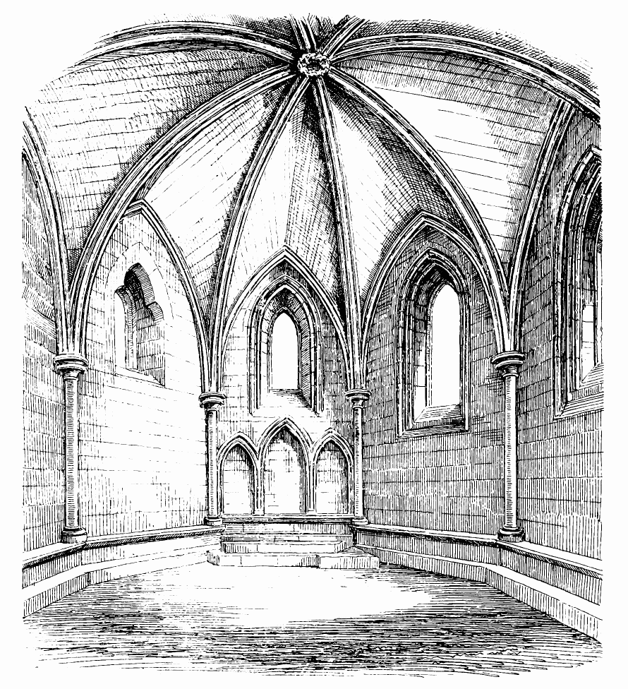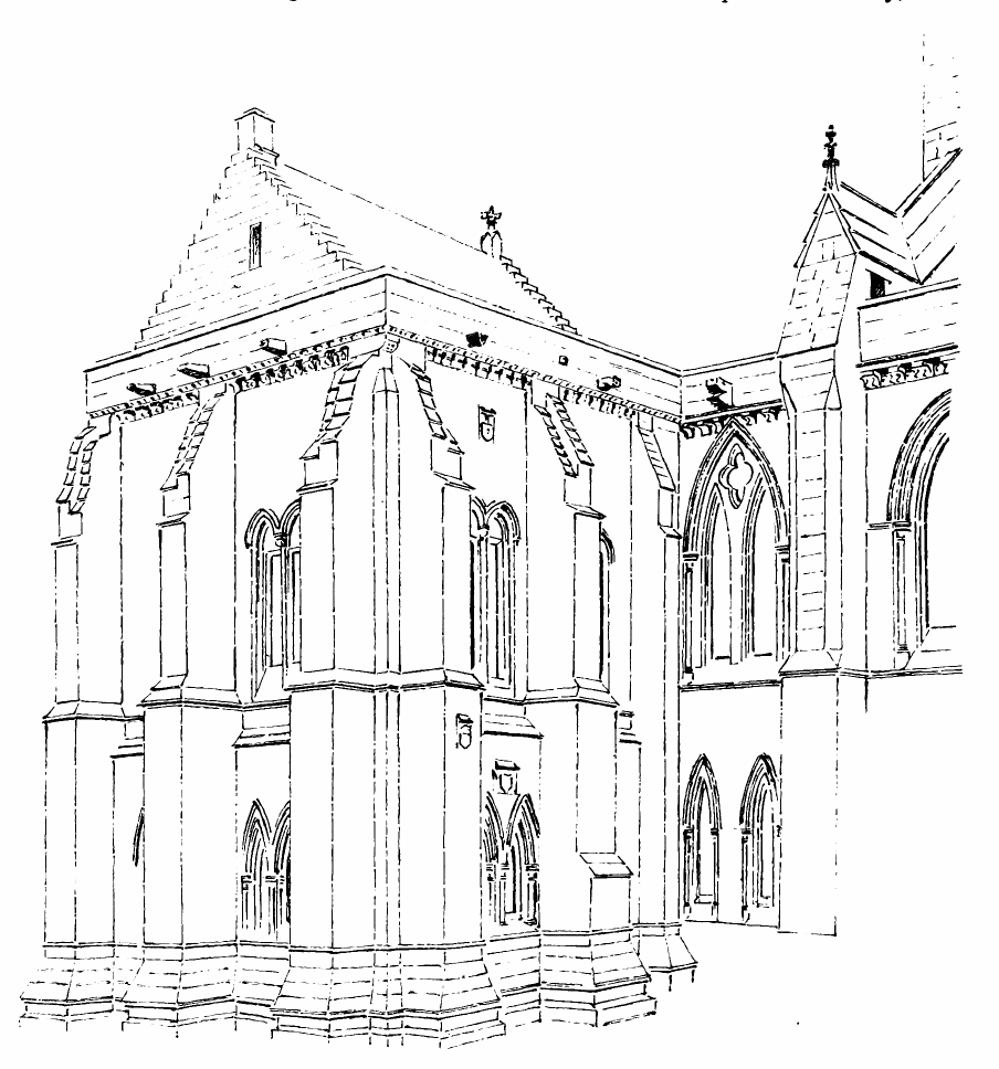 “He [Halderston] built the eastern gable from the foundations, along with its arch [arcuali voltâ].” As Lord Bute remarks—“This must mean only the east window, the greater part of the east wall being of transition work” (see Figs. 443-444.) “He adorned pleasingly the hinder vestry [revestiarium] with the reliques and other restorations and cases [clausaris] at considerable expense.”