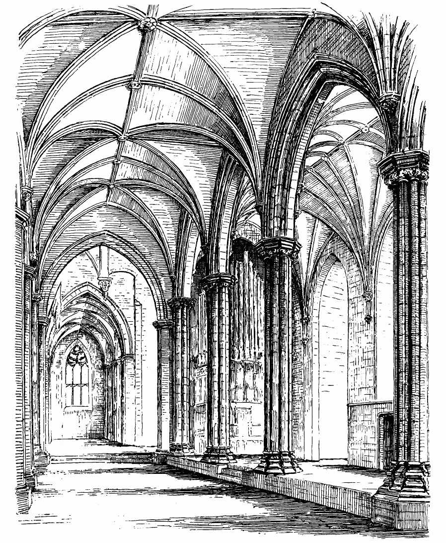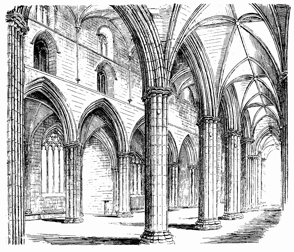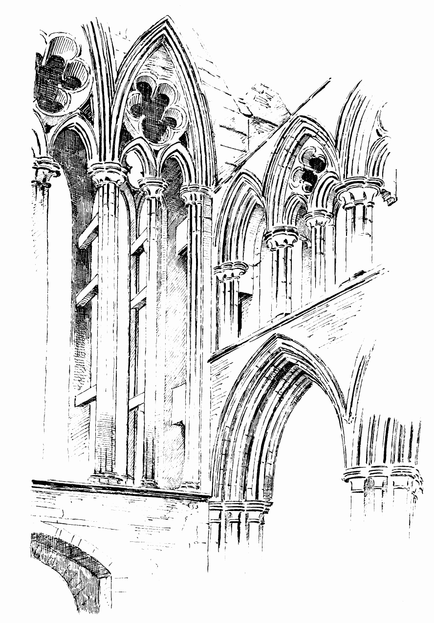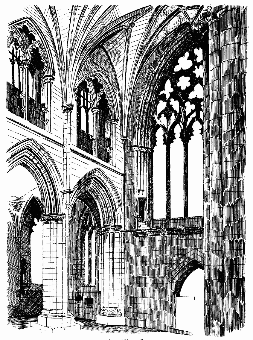 In Elgin Cathedral the vaulting shafts, which are mere{x} beads, descend to the ground, and the clerestory arcade is almost continuous.