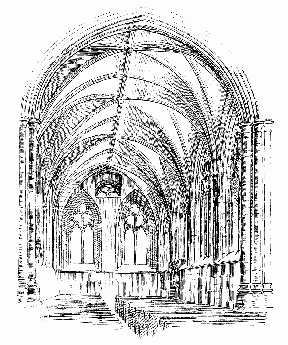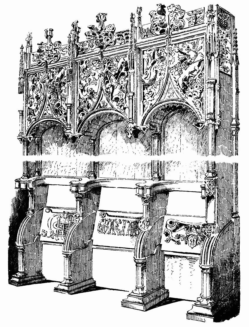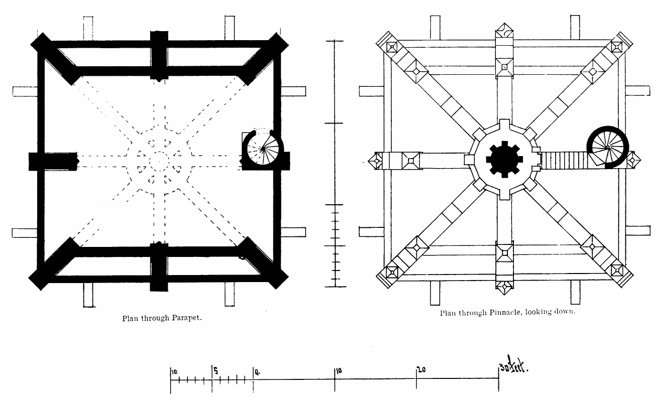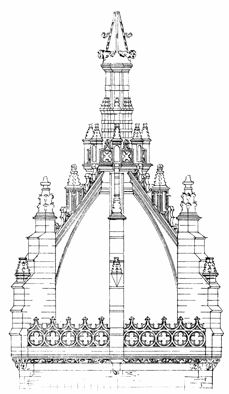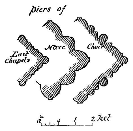 The vaults are counterpoised with suitable flying arches (see Fig. 766) abutting on solid buttresses, loaded with lofty pinnacles, which give them due resistance to the thrusts brought to bear on them. The windows in the south chapel walls (and clerestory of choir) are larger than usual, and are filled with tracery; but there is here also an unnecessary amount of plain wall between the bays, especially in the nave clerestory.