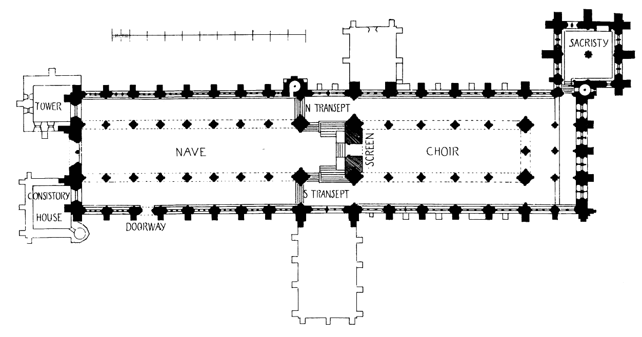 “He [Prior Halderston] adorned the church of his monastery with wonderful and remarkable beauty, both in the carving of the stalls and in the painting of figures. The nave of this church had been erected by his predecessor, the Lord [prior] James Bisset, of worthy memory [who sat from 1393 to 1416], in a sumptuous manner, with rafters and ceilings [tignis et tecturis], but inside it was an empty, vast, and deserted synagogue. He [Halderston] fitted it throughout in becoming manner with glass windows, along with the erection of altars, figures, and decorations and polished pavements.” Lord Bute asks—“Did he add the altar against the screen which crosses the south aisle just west of the eastmost door into the cloister?”