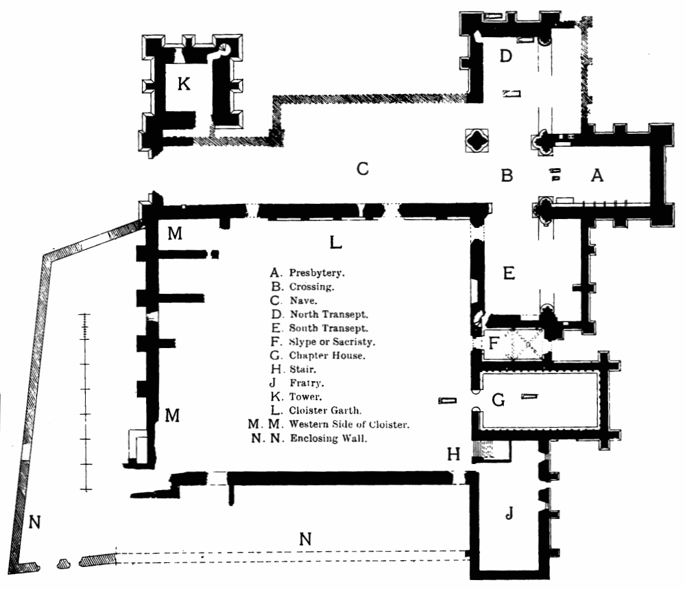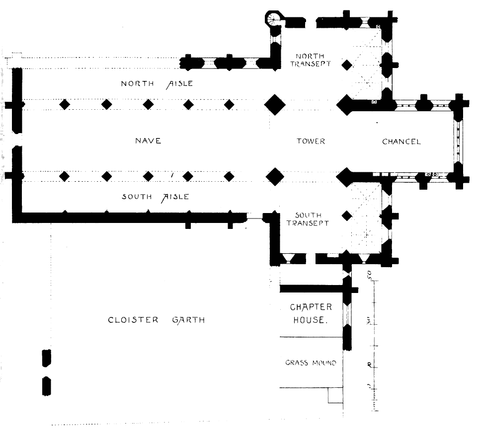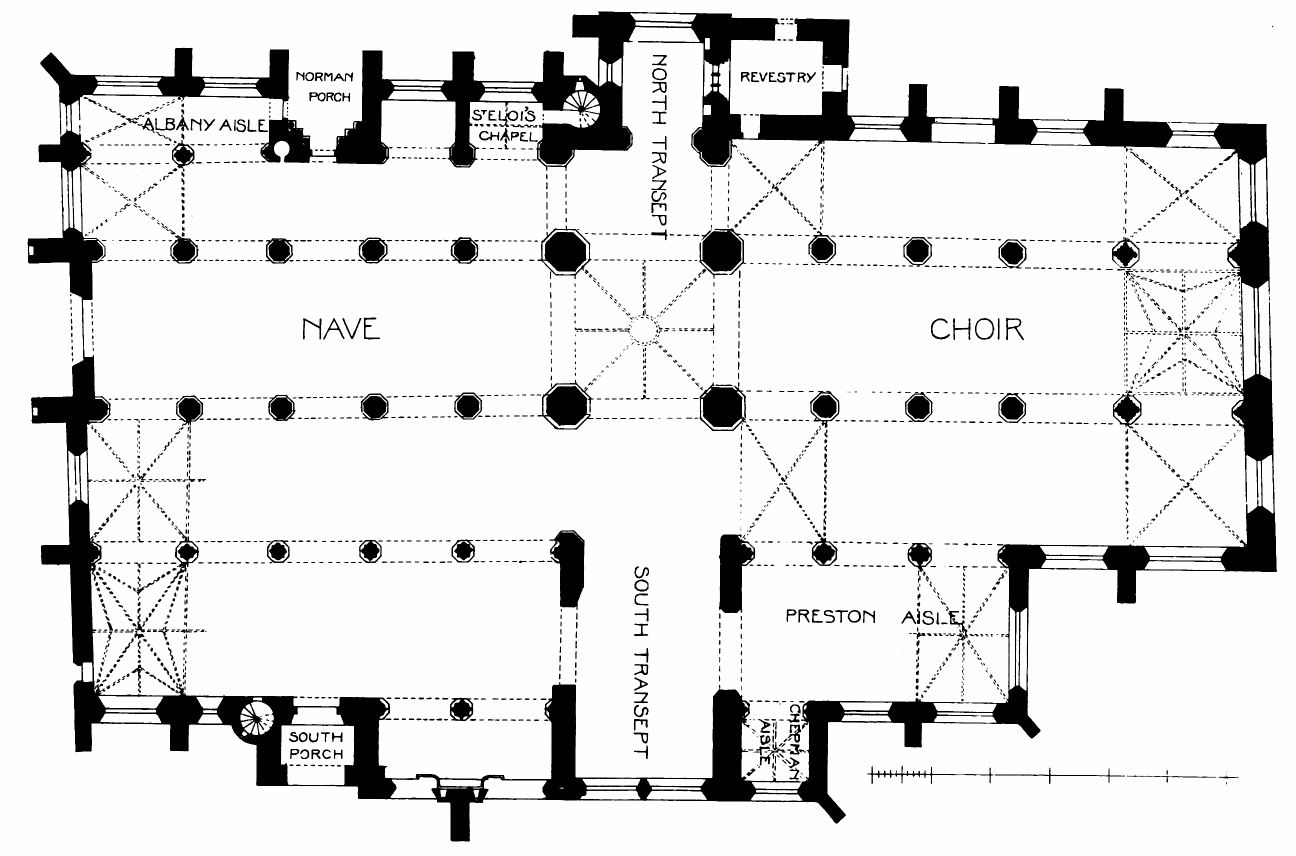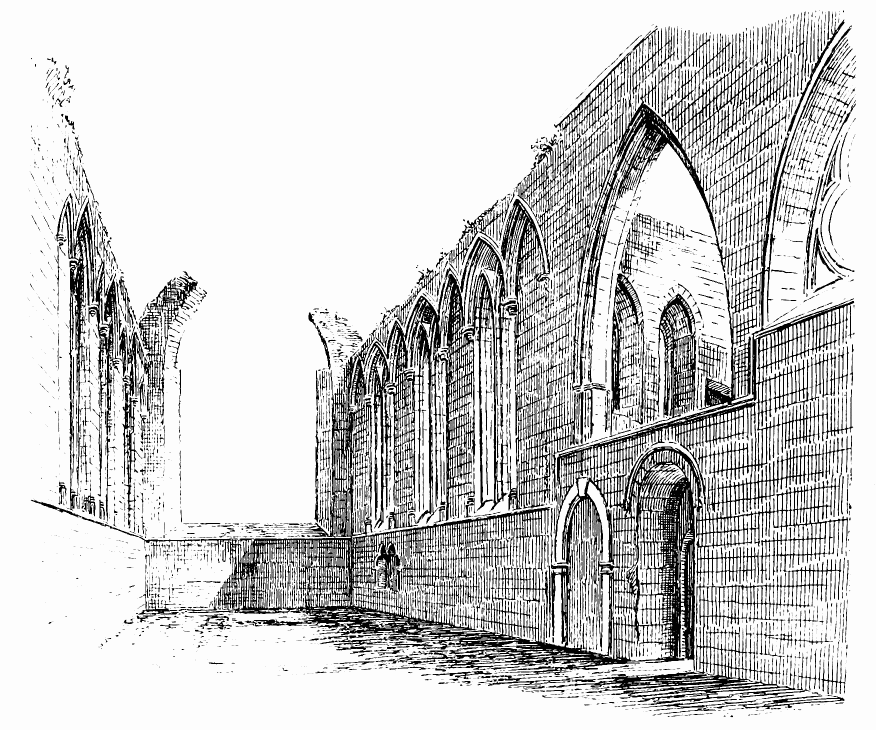 2. That the nave was, to a large extent, rebuilt and roofed by Prior James Bisset, about the beginning of the fifteenth century, but remained an “empty synagogue” till completed and furnished with glazed windows, altars, and decorations by his successor, Prior Halderston.