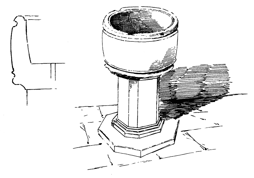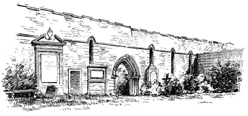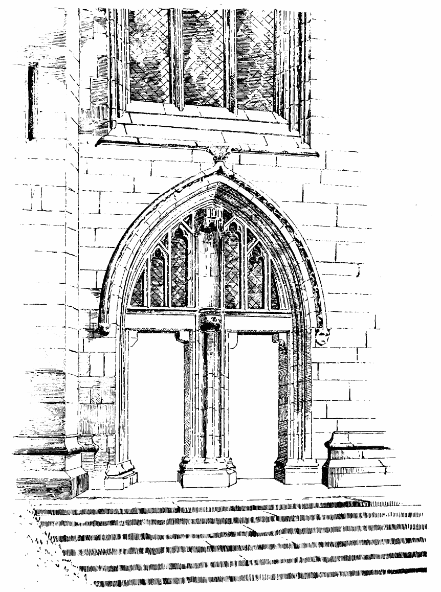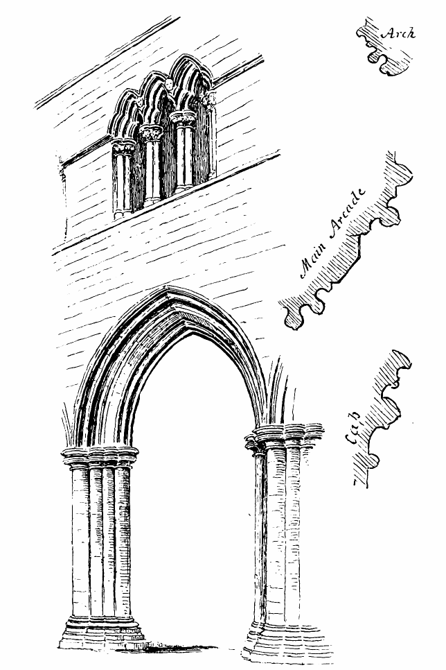 The west doorway from the cloister into the nave (which is in a modern vinery) has been opened up on the south side, and its massive first pointed architecture has been shown. The arch is pointed, and the details (including dog-tooth enrichments) correspond in style with the entrance to the chapter house (see Fig. 452).