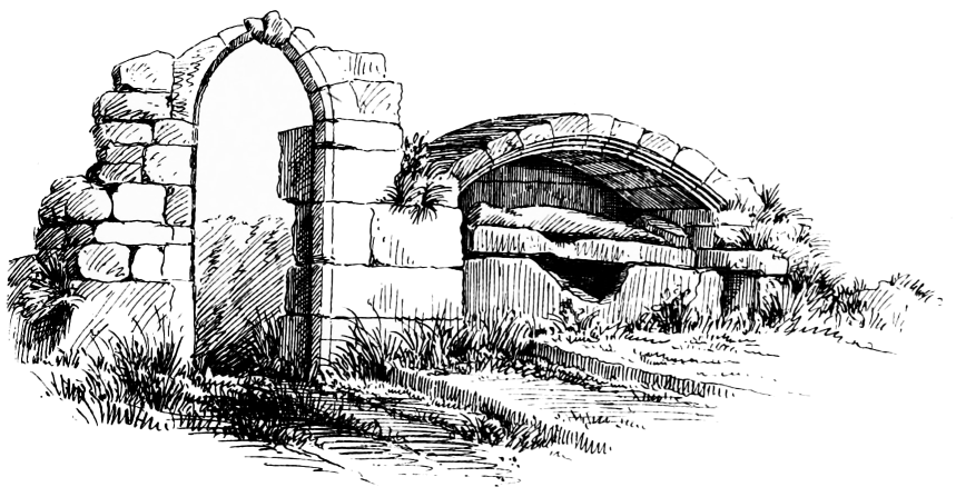 In the east range of buildings running south from the chapter house, the excavations have been continued, and the pillars of a vaulted chamber below the dormitory have been revealed. As this chamber contains a fireplace, it may possibly have been the day room or calefactory of the canons,{xiv} as only one fireplace (and that in the calefactory) was allowed in the monasteries. There is, however, some doubt as to whether this fireplace is original. At the south end of this chamber a deep drain or water channel, carefully built with ashlar, has been found. This was, doubtless, the main sewer of the monastery, through which there flowed a constant stream of water. The stream which fed the mill race (see Fig. 457) is not far distant. The latrines were, without doubt, situated above this sewer.