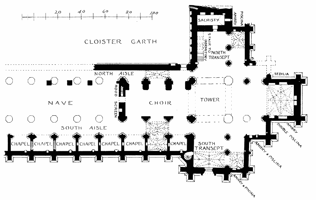 3. Numerous other works were carried out by Prior Halderston. He it was who altered the east end, and introduced the single large window in place of several smaller ones. He also executed the pavement of the choir, transept, and cloister walk, and rebuilt the prior’s palace. He likewise carried out other works, the sites of which are indefinite; and he obtained for the priory the pastoral insignia.