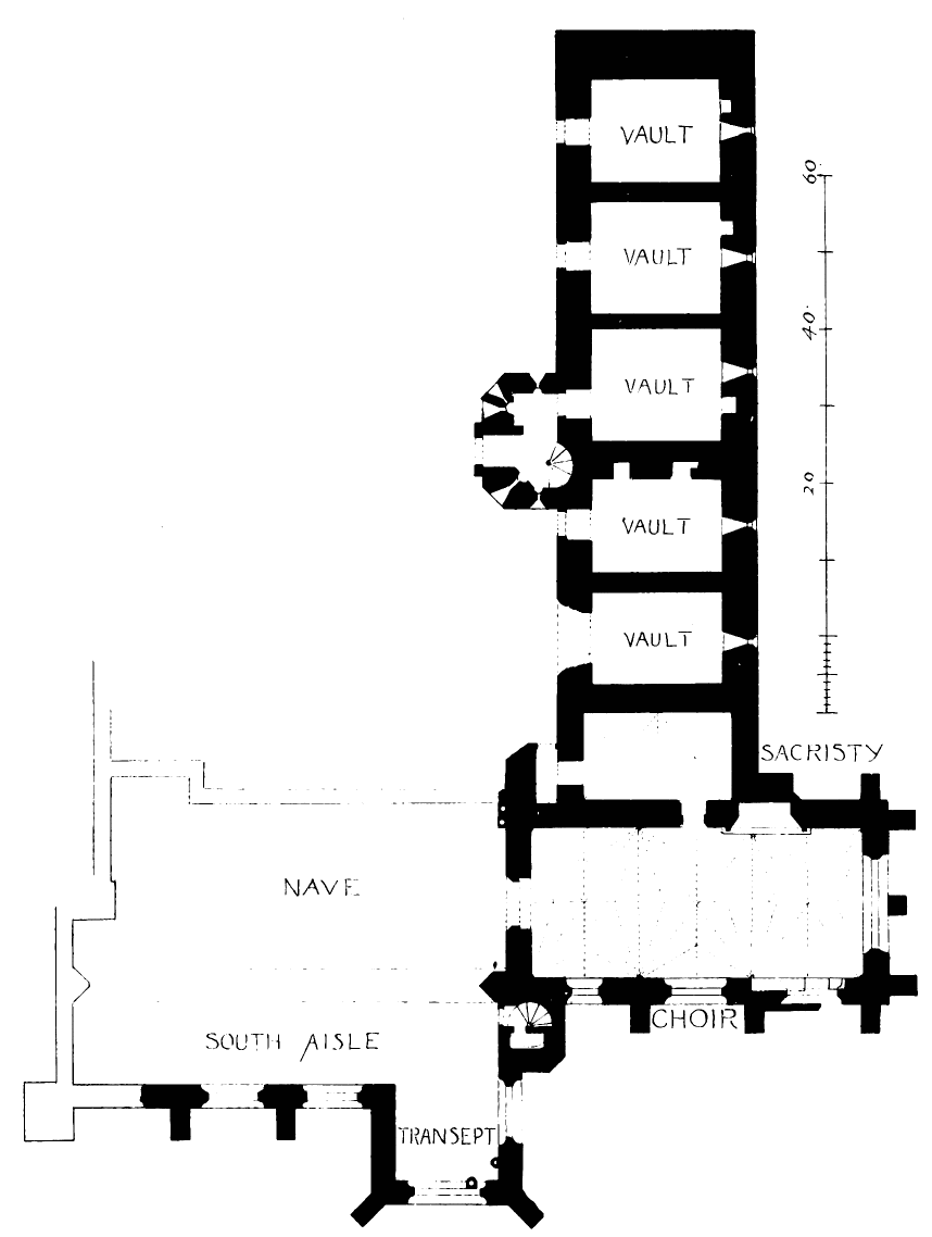 Lord Bute thinks that “the revestiarium is evidently the east end of the church behind the high altar, sometimes wrongly called the Lady Chapel,” and refers for the use of this term to the contemporary accounts of the death of the Red Comyn, in which he is sometimes stated to have been dragged by the friars into the vestry, and sometimes behind the altar, thus showing the space behind the altar to have been the vestry.