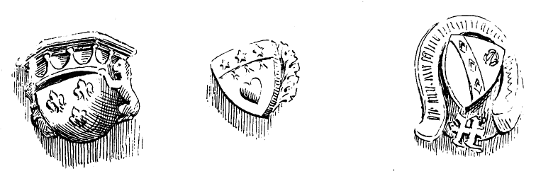 [101] “A Boar’s head, and on a chief indented 3 mullets, which are probably the arms of James Hasmall, who was abbot of the monastery at this time.”—Descriptive Catalogue of Ancient Scottish Seals, by Henry Laing, No. 1090. Laing gives no authority for this supposition; while in the Workman MSS. the same arms are assigned to Schewall of that Ilk. Edward Schewall was abbot in 1526 and 1528. When he died is not known. So that it is quite as likely that the arms on the sixth shield are those of Abbot Schewall as that they refer to Abbot Hasmall.