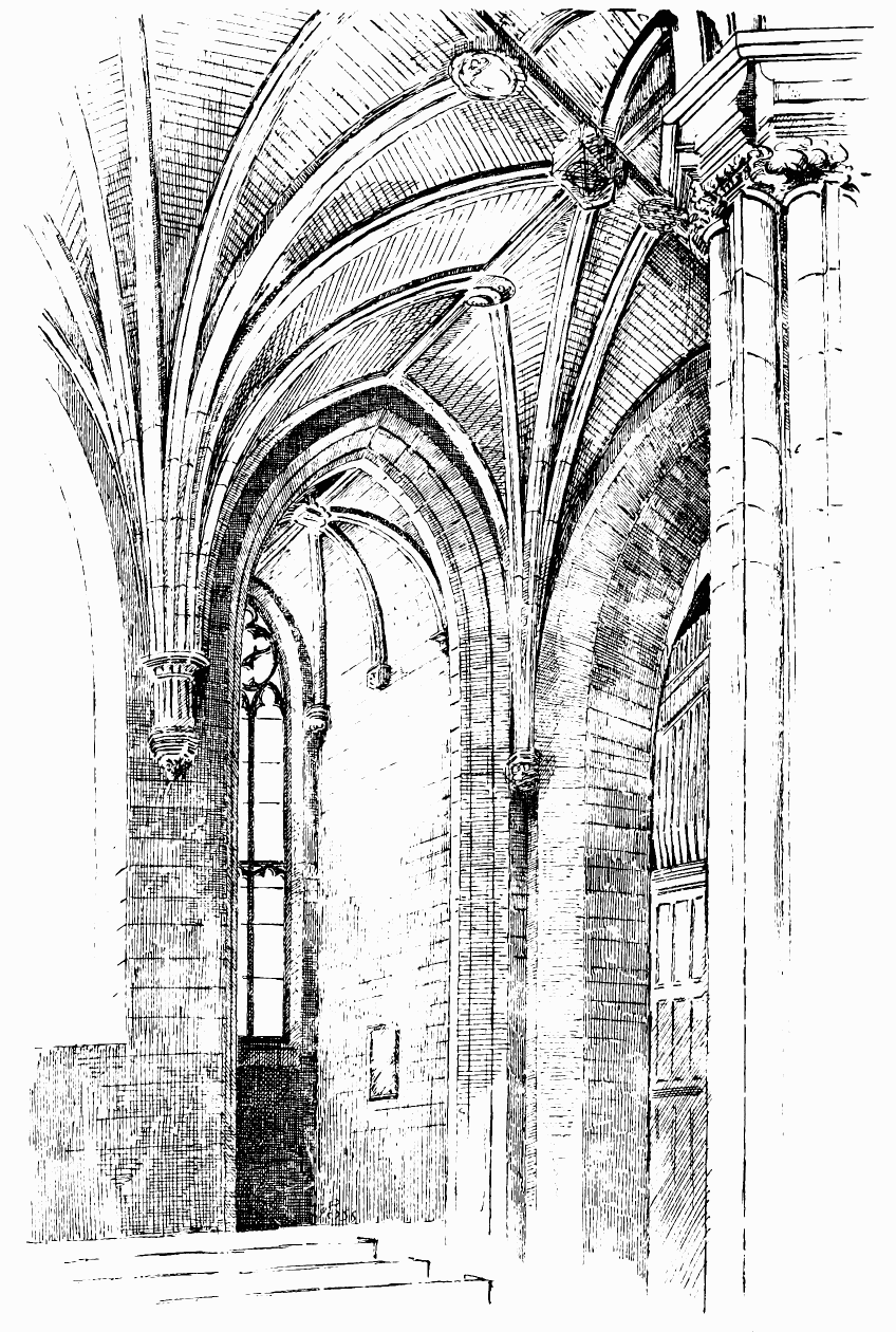 Probably one of the Scottish edifices in which Gothic principles are best exemplified is Melrose Abbey. The whole building was vaulted with stone, and the vaulting was chiefly groined. The ribs (see Fig. 767) descend on the caps of vaulting shafts of trefoil section, the central division of which rests on a corbel at the level of the main pier caps, while the other two divisions of the trefoil shaft descend without interruption to the base of the piers. That at least was the design, although it was in some of the piers interfered with by the introduction of a screen. In the south aisle also the vaulting ribs are carried on wall shafts or responds, which descend to the bases; but there is an unnecessary amount of wall on each side of these shafts and over the longitudinal arches, which lead into the outer chapels.