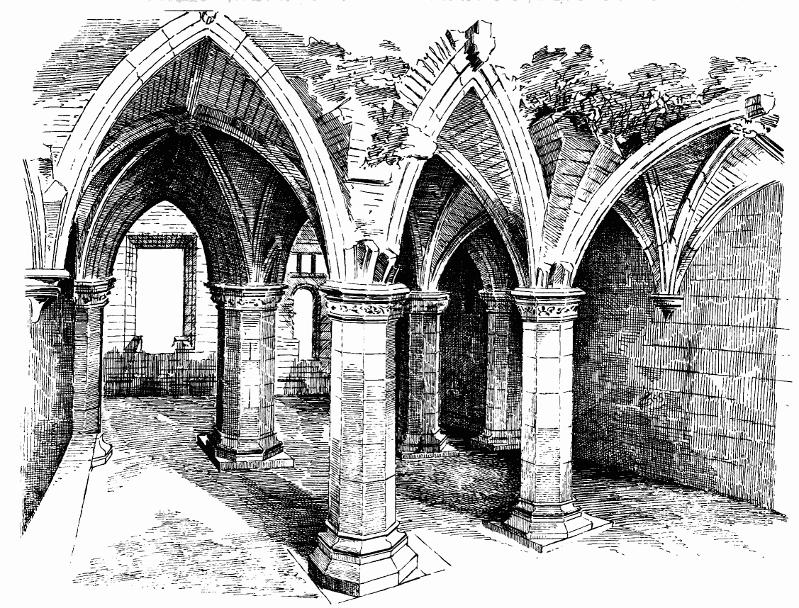 The whole of the crypt of the refectory (see Fig. 454) has been excavated and the pillars uncovered, showing that there were two rows of pillars and three vaults in the width of the building. The pillars, which are round, have been restored so far as they were incomplete, and so have the groined arches, the new work being executed in red sandstone, so that it may be easily distinguishable from the old work, which is of a light coloured freestone. The masonry of the old pillars being considerably shattered, it has been found necessary, in restoring the crypt, to insert an iron column in the heart of each pillar, in order to give them sufficient strength to carry the weight of the vault. It is not known to what use this crypt was applied.