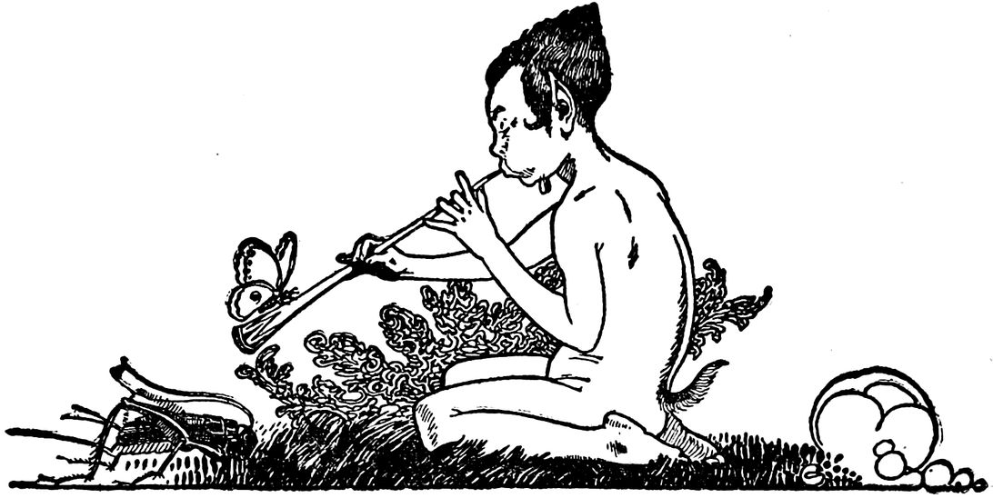 “Well, my children will be able to eat, I can tell you. See, I have laid my eggs on this bed of parsley. Ah! there’s a larva now. Not mine, but mine will be like it. See, he is green, ringed with black and yellow. 206If you tease him he will stick out his yellow horns at you, and you won’t like the odour either. Would you believe I was once like that, and I slept in a pupa case like the one under the twig there? You know there always comes a time in the life of every caterpillar, if he lives long enough of course, when he stops eating for good and wants nothing so much as to sleep. That came to me, and I crawled from the parsley bed to an old rail fence and began to spin. The silk was in my body, and it came through two tubes in my lower lip.”