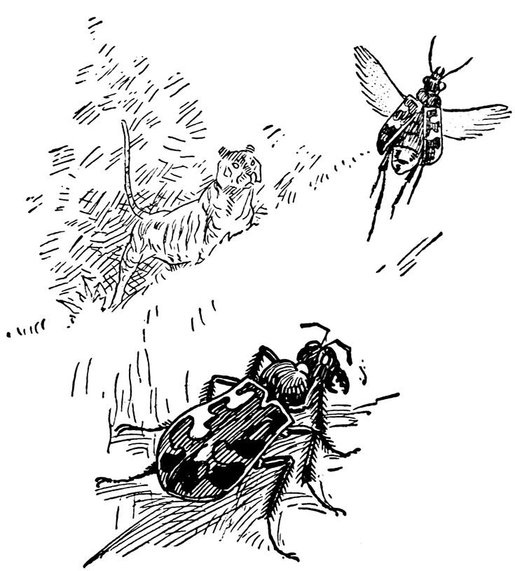 “Well, birds are pests, there is no doubt about it, and if it hadn’t been for them we insects would have possessed the earth long ago, but you forget, we always choose a place that is nearly the colour of ourselves, and we look so much like our surroundings that it would take a sharp eye to find us. We are not brightly coloured, as a rule, like the butterflies, or if we wear gay colours at all it is usually on our hind wings, which we hide under the fore wings. Now the general remarks being made, the audience may view the exhibits and hear their individual histories.”