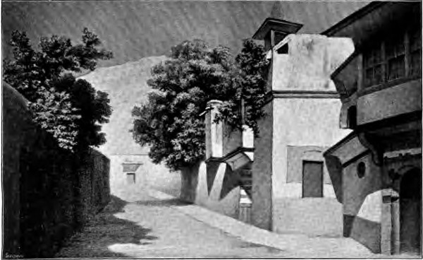 During the first weeks at Damascus my only work was to find a suitable house and to settle down in it. Our predecessor in the Consulate had lived in a large house in the city itself, and as soon as he retired he let it to a wealthy Jew. In any case it would not have suited us, nor would any house within the city walls; for though some of them were quite beautiful—indeed, marble palaces gorgeously decorated and furnished after the manner of oriental houses—yet there is always a certain sense of imprisonment about Damascus, as the windows of the houses are all barred and latticed, and the gates of the city are shut at sunset. This would not have suited our wild-cat proclivities; we should have felt as though we were confined in[376] a cage. So after a search of many days we took a house in the environs, about a quarter of an hour’s ride from Damascus, high up the hill. Just beyond it was the desert sand, and in the background a saffron-hued mountain known as the Camomile Mountain; and camomile was the scent which pervaded our village and all Damascus. Our house was in the suburb of Salahíyyeh, and we had good air and light, beautiful views, fresh water, quiet, and above all liberty. In five minutes we could gallop out over the mountains, and there was no locking us up at sunset. Here then we pitched our tent.