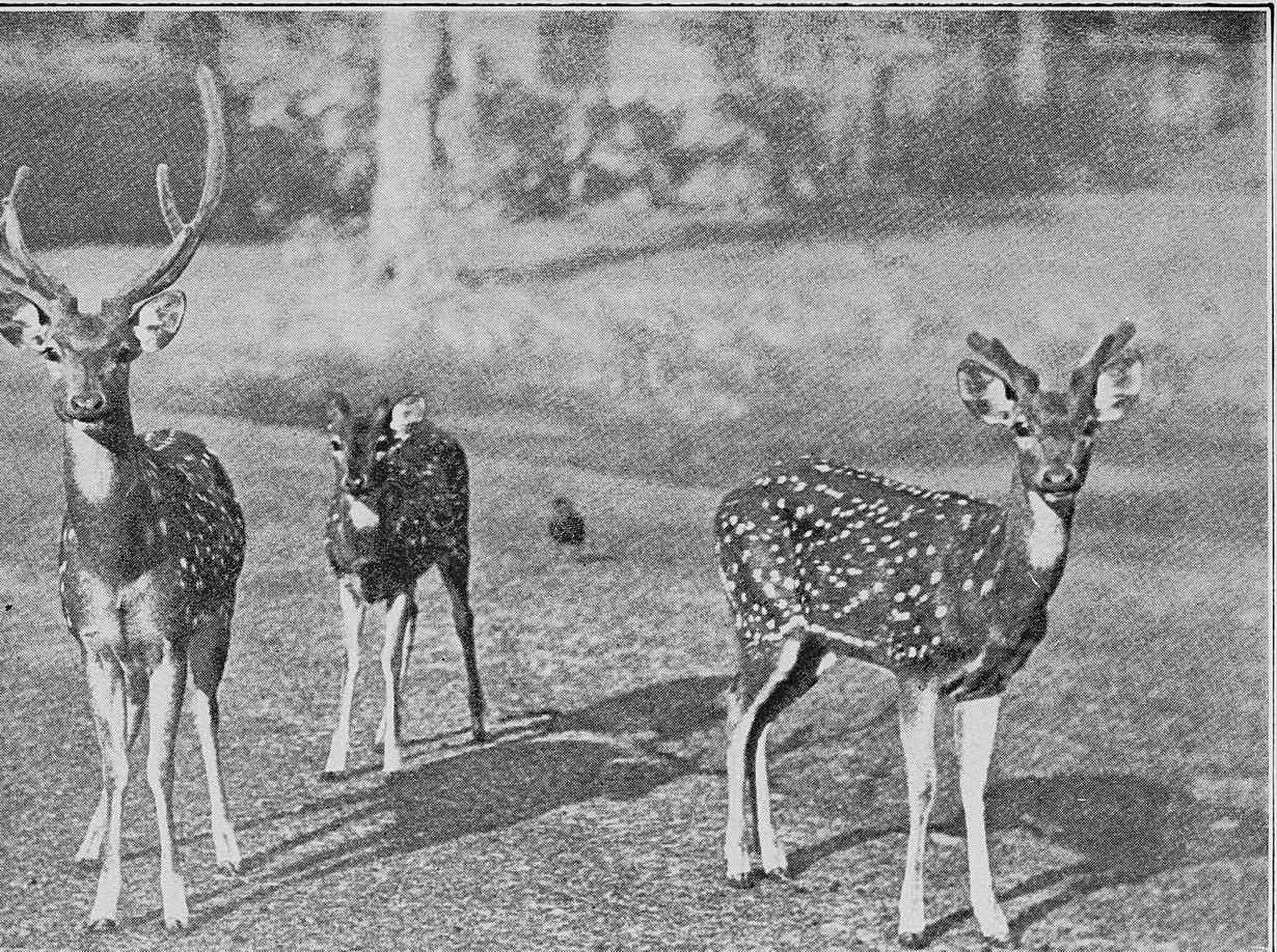 In the open paddocks and runs of the smaller deer and wild-fowl, there was great good-temper and content. The Japanese deer were all curled up sleeping in the cold air round their food-box, which was filled with chopped straw, bran, and oats, and swarming with impudent Zoo sparrows. These little robbers, as also the Zoo starlings, are in such good case from the abundance of food left at their disposal by the fastidious strangers in the cages and paddocks, that, like the owls during the plagues of mice on the Pampas, they defy the weather and the seasons, and marry and bring up irregular families irrespective of the almanac. Dozens of them, as well as many of the starlings, had selected this particular cold morning of all others to take a bath. The gradually sloping drinking-pools in most of the runs, especially the tortoises’ baths, which have a wide shallow entrance, exactly suit their wants. Many were washing and splashing in the pools in the swine runs, while others were drying themselves in rows on the sunny wall above the styes, with an immense amount of fuss and vulgarly loud conversation.