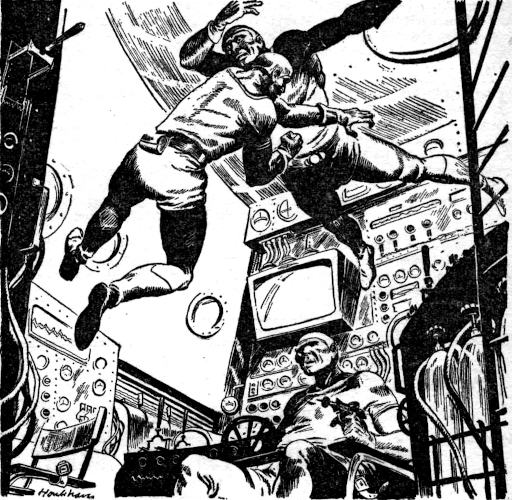 The cabin whirled about them. He felt Birkerod's powerful grip around the hand which held the gun. Simultaneously they reached the ceiling; Pappas's head hit metal with a crack. The gun fell free. Weightless, the two of them wrestled desperately.