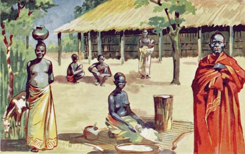 Inside such a house as has been described, and in many a smaller one, are born the children of Africa. At first and for a few days they are not black. I am told they are pink in colour and quite light, but that they soon darken. The mothers and grandmothers are very pleased to welcome new babies and bath and oil them carefully. Nearly all the women one meets about a village have children tied on their backs, or are followed by them toddling behind. These mites glisten in the sun as they are well oiled to keep their skins in good condition.