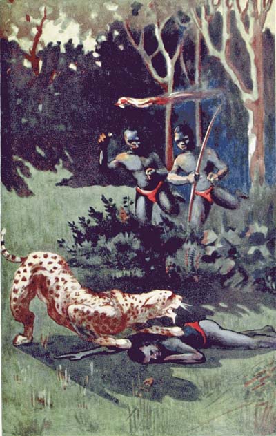 [93]“Now one morning early Gwebede got up and had just stepped out of the grass shelter where he slept, when a great leopard sprang on him, caught him by the back of the neck in its mouth, and bounded off with him as easily as a cat would do with a mouse. Gwebede’s brothers are waked from their sleep, and look out. ‘A leopard!’ they shout as they seize hold of the red brands of their evening fire and rush out yelling as they run. Into the grass they dash: yonder is the leopard: after him! He is frightened: he drops the boy: he is off!