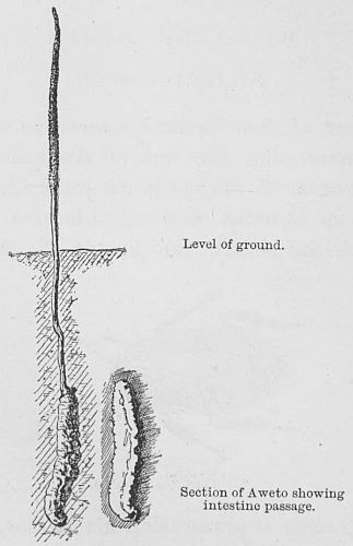 The Kauri bug (called by the Maoris the [184]Kekereru), with its power of emitting a terrible and unbearable smell when alarmed, has been so often and so fully dealt with by writers, that I shall content myself with simply making a sketch of the insect, leaving its smell to the imagination of my readers, and will proceed to describe the most curious of the New Zealand native insects I have seen, called the bulrush [185]caterpillar (Sphœria Robertsia)—native name, Aweto. This caterpillar becomes changed into a white vegetable substance while still retaining its caterpillar shape. It is from three to three and a half inches in length, and when about to assume the chrysalis form buries itself in the ground, and it is supposed that in doing so, some of the minute seeds of a fungus become inserted between the scales of its neck; these the insect, being in a sickly condition, is unable to rid itself of, and they vegetate and spread through the whole of the body, completely filling and changing it entirely into a vegetable substance, though retaining exactly the caterpillar form, even to the legs, head, mandibles, and claws. From the nape of the neck shoots one single stem, which grows to a height of eight or ten inches, its apex resembling very closely the club-headed bulrush in miniature. This insect plant is generally found growing at the root of the Rata tree. It has no leaves, and if the stem by chance becomes broken off, another arises in its place, though two stems are never found growing simultaneously from one caterpillar. When fresh, the vegetable substance of which it is composed is soft, and has a strong nutty flavour, and the [186]natives are fond of eating it; they also use it burnt and ground to powder as colouring matter for tattooing purposes. In every instance the caterpillar is found perfect in shape and size, without any sign of contraction or decomposition, and it is therefore presumed that the vegetating process takes place during the insect's life. A section of the insect vegetable shows distinctly the intestine passage.