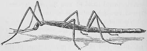 Another curious insect found here is the "Mantis," commonly called, on account of its shape, "the ridge-pole rafter." This insect has the power of changing its colour like the chameleon. It favours tea-tree more than any other plant, and if resting on a withered portion, assumes a corresponding brown colour, though when found on the young leaves it is a bright green. Its shape is most peculiar, and very suggestive of the name given it.