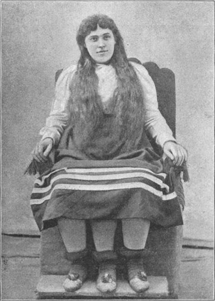 Schon bei seinem ersten öffentlichen Auftreten im Jahre 1886 wurde ihm von den Medicinern ein grosses[S. 79] Interesse entgegengebracht und sie erklärten ihn für einzig in seiner Art dastehend. Eine Menge schneeweisser Haare nämlich wächst wie ein offener Sonnenschirm von sechs Fuss Umfang auf seinem Kopfe. Es ist elastisch, kraus, elektrisch und wächst so üppig, dass es dem Kamms Widerstand leistet und nur mit Bürsten bearbeitet werden kann, und damit es nicht zu lang wird, alle vier bis sechs Wochen gestutzt, um nicht zu sagen geschnitten werden muss.
