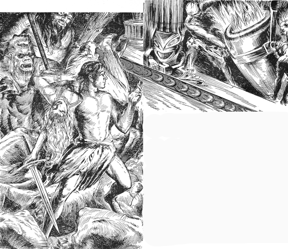 Slag gave a great cry of amazement. Looking down at them from his black pedestal, Thor felt a kinship toward the dwarf. He liked him. It had never entered Slag's head to throw his club. The blue eyes worshipped Thor, looking up at him. They made him feel good.
