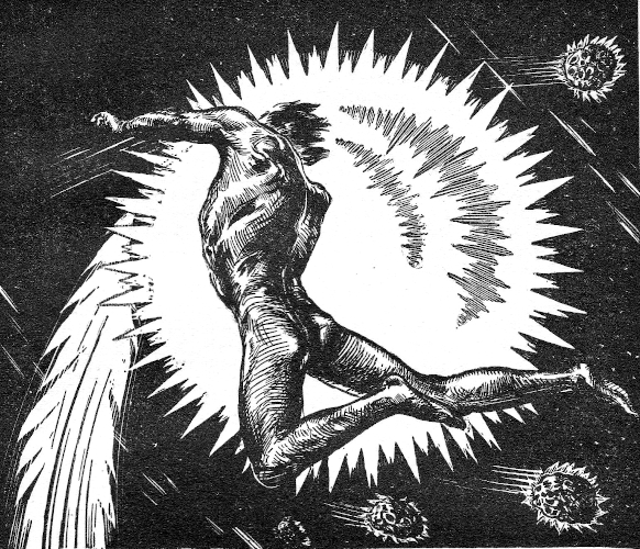 In that dim dawn of all things, when Time was unmeasured and Space was an empty void, before the strange mating of these two and the birth of the cosmos, the Rebel lived. Its streams flowed forth from unfathomable errors, seventeen-hundred billion years ago. It was a cancer of Space, and when Space met Time and flowed with it toward eternity, the Rebel fought. Time and Space sought to disgorge it, for it was the Rebel, and its own great tendrils of Space and Time heaved and raged like the corona of a giant sun. The tendrils leaped and danced, and once in a while they touched reality. And when they did....