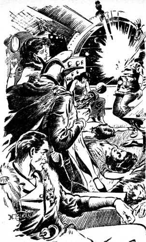 Slowly the General unfastened the broad gold buckle of his rich belt, his head bowed. Then, as he released it, he suddenly thrust up his left arm to free his black cloak, jerked the belt forward smartly, and clipped Thorne across the wrist with the buckle. The belt, weighted down by the heavy gun, was torn from his grasp, but it had at least knocked the Blandarc from Thorne's hand as well.