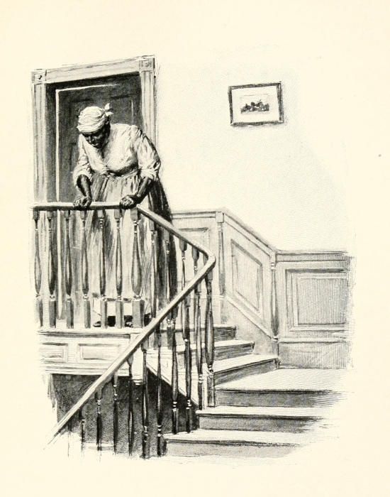 “Des come out on de back porch wid me, please’m. All I ax you is ter keep yo’ face straight, and don’t say a word less’n I ax you sump’n’.” She flung her hat and satchel in a corner and sallied out. “I don’t blame cooks fer wantin’ ter quit when dey’s so much gwine on up town,” she remarked, in a loud voice, as she went out at the back door. “Dey stan’ by a stove hot wedder er col’, an’ dey ain’t got time ter go ter buryin’s. But me! I don’t min’ de work; I’m ol’ an’ tough. Why, de well ain’t so mighty fur fum de steps, an’ dar’s de wood-cellar right dar. How much you pay yo’ cooks, ma’am?”