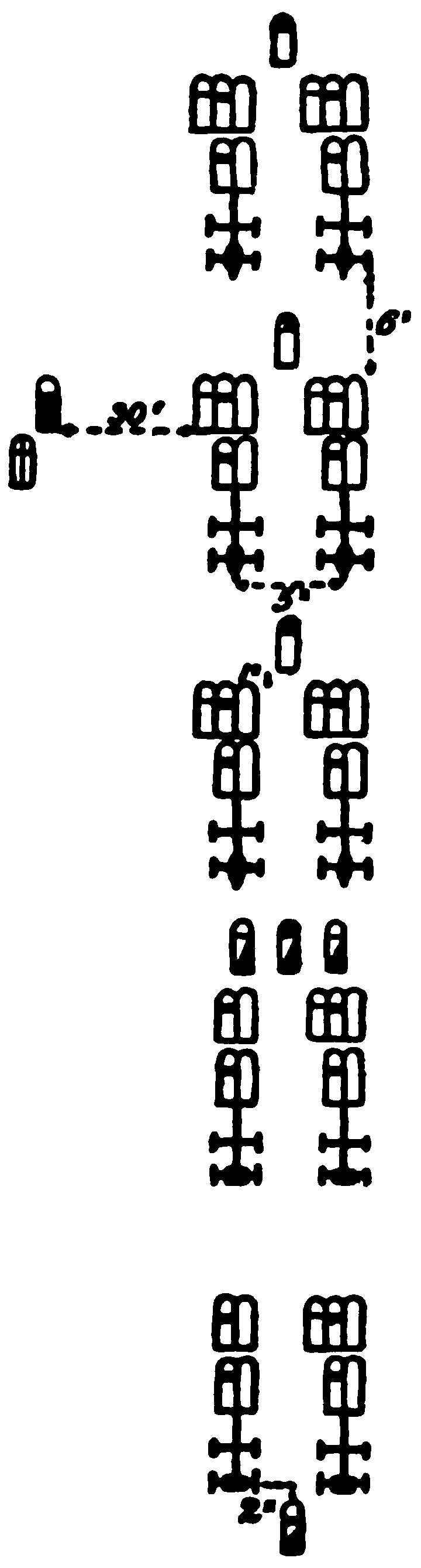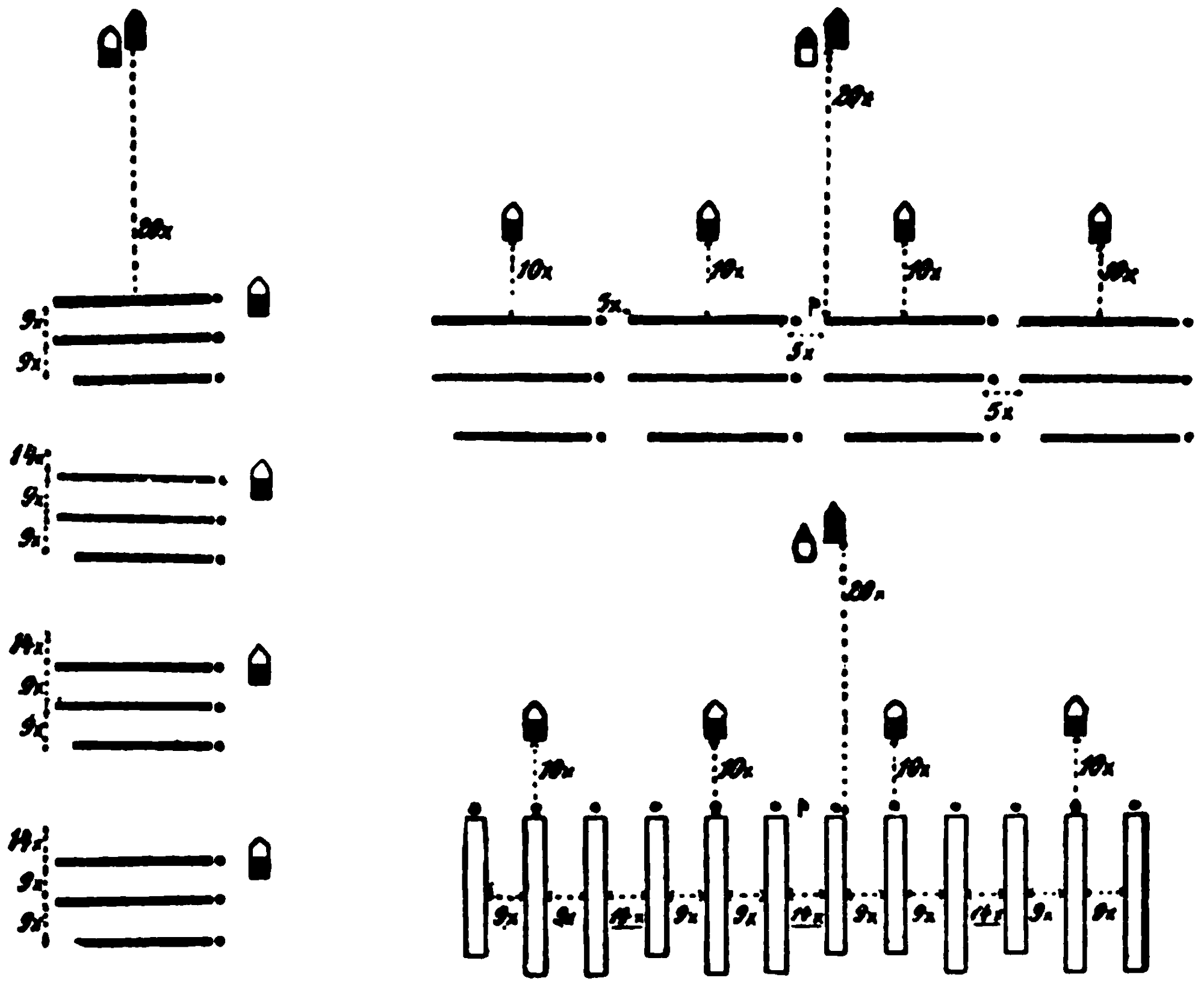 On the battlefield, ammunition wagons, unless they have been emptied, follow the movements of the several companies and take up a position under cover, indicated by the wagonmaster,[478] as close as possible to the firing line—never more than 800 m. in rear of it. In urgent cases, this must be done without regard to losses. The firing line is supplied with ammunition, when practicable, by the reinforcements sent forward. When the firing line is about to run short of ammunition, this fact is communicated to the troops in rear by repeatedly making the signal “m”. This signal, when made to the front by the troops in rear, signifies, “ammunition is coming up at once.”