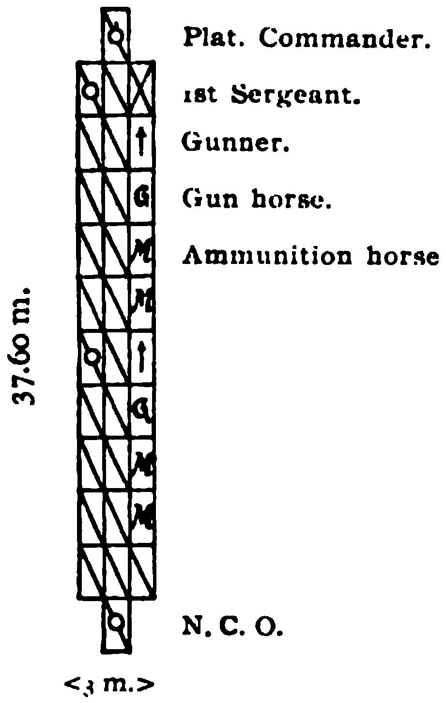 [518] In each battalion, the ammunition wagon of the 2nd company carries 108 explosive cartridges, weighing 200 g. each, and that of the 3rd company carries 48 fuzes.