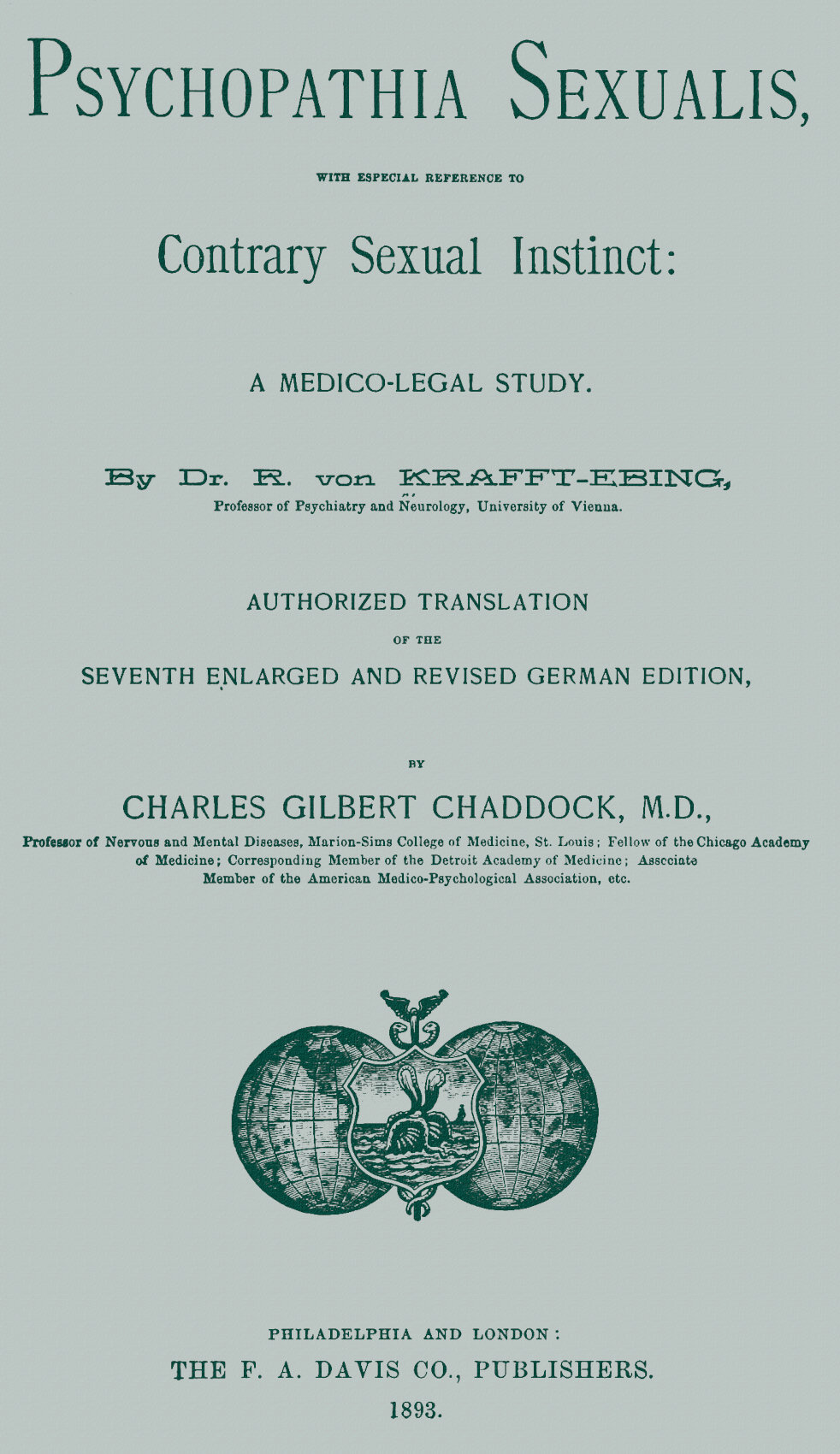 By Dr. R. von Krafft-Ebing, Professor of Psychiatry and Neurology, University of Vienna. Authorized Translation of the Seventh Enlarged and Revised German Edition, by Charles Gilbert Chaddock, M.D., Professor of Nervous and Mental Diseases, Marion-Sims College of Medicine, St. Louis; Fellow of the Chicago Academy of Medicine; Corresponding Member of the Detroit Academy of Medicine; Associate Member of the American Medico-Psychological Association, etc.