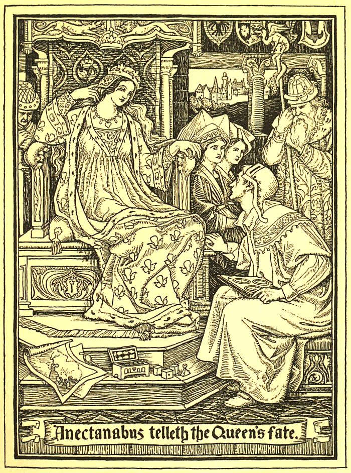 Now every day the queen sat on the royal seat in the great hall of the palace, and men came to her[11] and spoke before her of good and bad, and among the rest next day came Anectanabus. And as the queen looked upon him, he bowed him down, and said, “Hail, fair Queen of Macedon;” and the queen noted his speech, for he spoke as one that was a king and not as a clerk, though he were clothed in weeds of drab and went with shaven crown. So she made him to sit down before her on a silk-covered seat, and she began to question him full fairly, whether he were of Egypt, and what manner of folk were in that land, and what was the learning of its wise men—for she knew by his tongue that he was an outlander, and be like an Egyptian. And Anectanabus answered her and told her of the land of Egypt, and of its wonders, and of its wisdom, how some men told the meaning of dreams, and whether they were true or false, and when they should come to pass; some men understood the song of the birds and the voice of beasts; some could tell of the birth of children, and of the length of life; some could declare the secret counsels of men, which never were spoken to any one; and some could read the course of the stars and the signs of heaven, and say what shall come to pass in few years’ time—“and, fair Queen,” continued he, “I have so clear a knowledge of all these arts, that I can prove myself a master in each of them.” So saying, he leaned forward from his seat, and stared in a study, still as a stone, at her face. Then said the queen, “What art thou musing[12] on, Master; why dost thou sit so still?” “I am thinking, O Queen,” said he, “on the words of my god, who long ago told me that I should sit in a strange land an exile, and see the fairest queen on earth.” Then the queen prayed him to show her how he sought out these things, and he drew out of his bosom a little box with seven pieces of ivory in it, and he showed her how by casting these he could tell what should happen to men, and answer questions about their deeds. And he showed her seven precious stones, on each of which a wondrous figure was carved, which preserved men who wore them from all harm. And then he drew out his table of ivory with three rings upon it, by which he read the stars: the first ring was of brass, and on it were marked the twelve houses of fate; the second was of bright silver, and on it were marked wondrous beasts, the twelve signs of the heavens; and the third was of red gold, and on it were marked the sun and the moon; and as he showed them he told her the course of the stars, and how they governed the life of men.