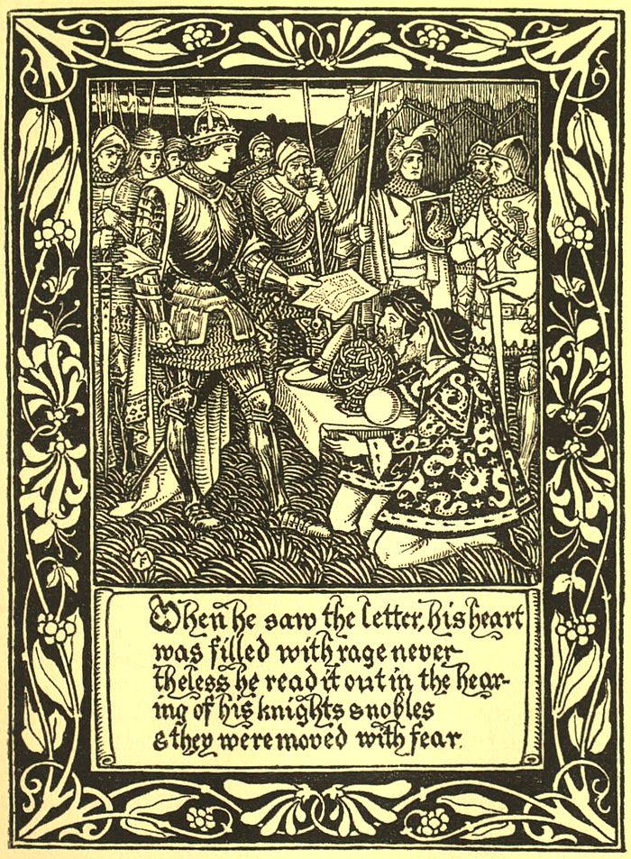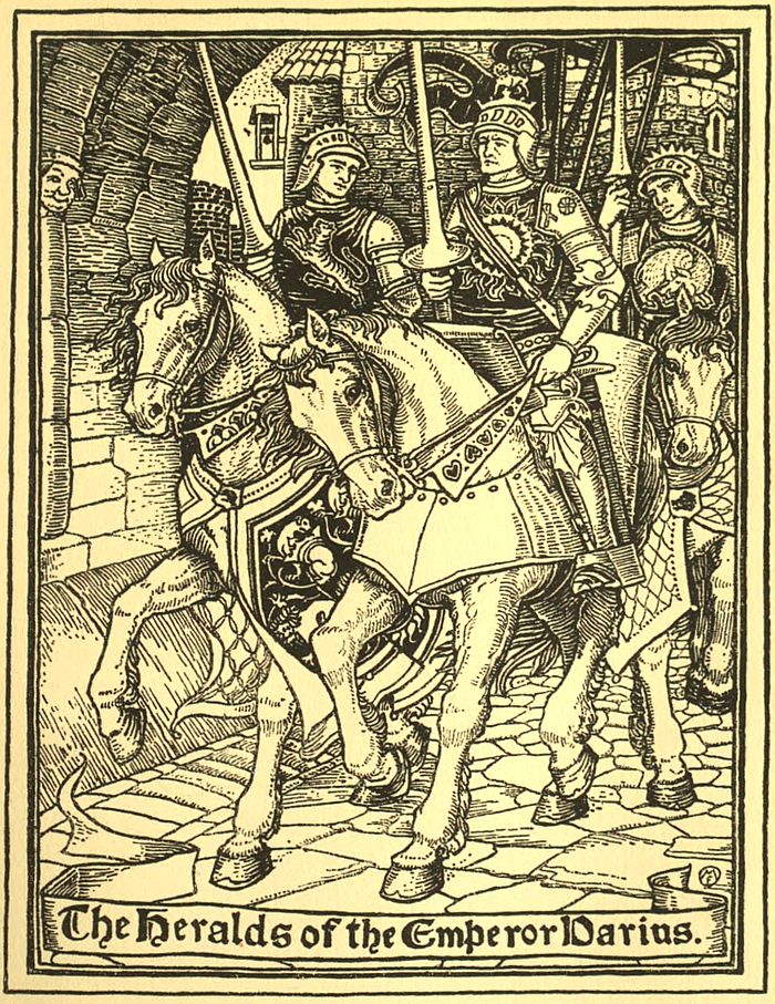 Now the king was sitting on his throne under the daïs at the upper end of the hall, and on his right hand sat the noble Alexander, and round the king on his right and his left were the nobles of the land, greybeards and youth. And when the coming of the heralds was told them the king rose from his seat, and as they stepped forward so did he, and he came to the middle of the hall and three steps further, for all men did reverence in those days to the herald. And he greeted them, and on the neck of each man he threw a chain of gold, and much he praised them for their fame. But the heralds spoke and said, “O king, we have a message for thee, nor may we delay.” And he said, “Speak on.”