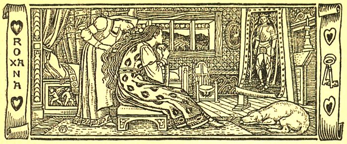 As to the giving in marriage of the daughter of Darius, the Emperor of Persia, it is to be told that on a set day the wise men of the land came before him, and the painter brought out to them the portraits he had made, and they examined them but found none that was worthy to rule, for one was covetous, and another quarrelsome, and a third given to much speaking, and these faults the wise men read in the faces on the parchment. Then they came to the likeness of Alexander and all men said “This man is born to be lord of men” and they brought it before Darius, and he sent for his daughter Roxana, and made her stand by the picture, and when she did so, she was[40] taller than the figure painted thereon. Then Darius turned away and said nought, but shook his head, and Roxana took with her the cast-away drawing and bore it to her own rooms, and kept it safe; and she vowed offerings to the gods if they would make this man her lord and husband.