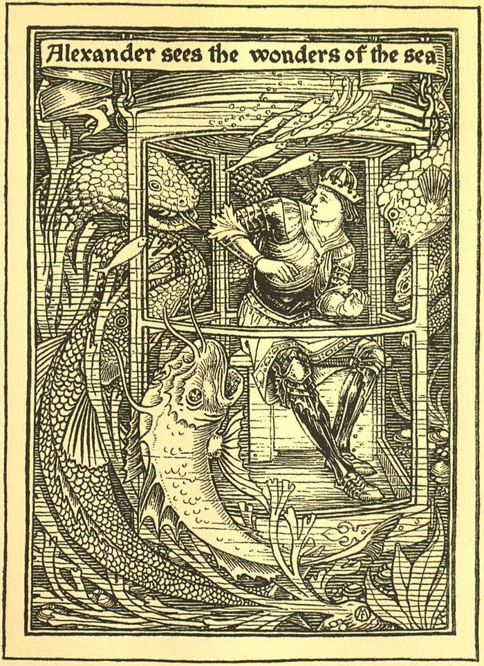 After these things the heart of Alexander was lifted up and he thought within himself that he was even as one of the high gods, for he had travelled through the air, where no man had been before, borne by griffins on an iron throne, and he had saved all men from the foes of mankind, and he had raised himself above all men in power and dignity, nor had any man conquered him or stood before his face. So when his army turned and came to the shores of ocean, a new thought came into his mind how that he would see the wonders of the sea, and the things that live there, and come not up to the surface of the deep.