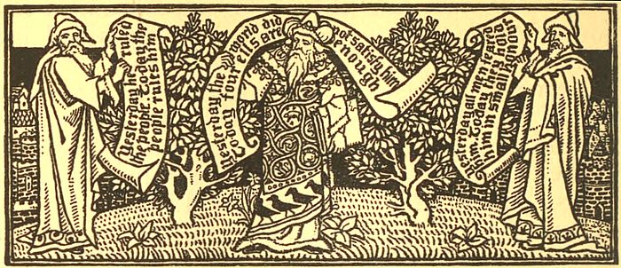 Howbeit Alexander made no sign to them of his joy, for he seemed not to believe the old men, and he said: “Have I spread the might of my name from the East even unto the West to no end but to become a sport to old men and dotards.” Then the old men made oath by the gods that this thing was true, and they told the King how that these trees spoke both in the Greek and the Indian language; and Alexander asked them of the way to this marvel, and the men answered: “O King, whosoever thou art, no greater marvel shalt thou see than this we tell thee of. The way to it is a journey of ten days, nor can your army pass because of the narrow paths, and the[160] want of water, but at the most four thousand men with their beasts of burden and their food.” Then all the friends of the King and his companions besought him to go and see this great thing, and he made as if he hearkened to their prayers, and consented to go with them. So he left the army with its baggage and the elephants in the hands of King Porus his friend, and set out on the Northward Way to seek the trees which spoke to men.