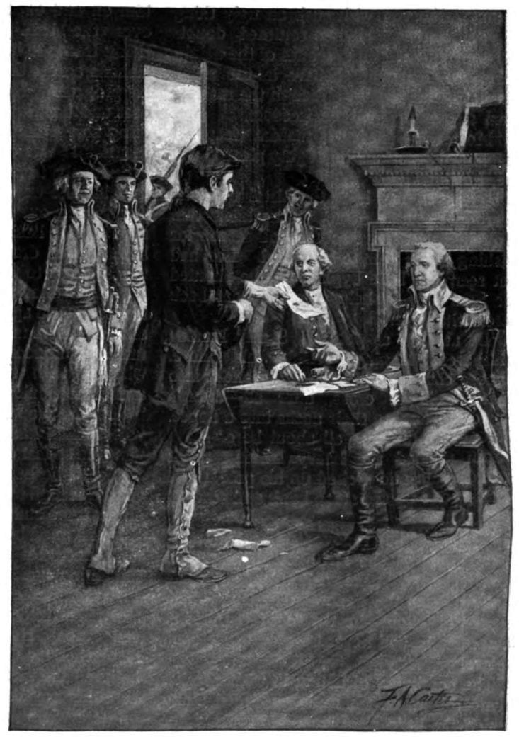 The story opens in the year 1777, during one of the most critical periods of the Revolution. Hadley Morris, our hero, is in the employ of Jonas Benson, the host of the Three Oaks, a well known inn on the road between Philadelphia and New York. Like most of his neighbors, Hadley is an ardent sympathizer with the American cause. When, therefore, the bearer of dispatches, having been captured on his way to Philadelphia, gives Hadley the all-important packet to be forwarded to General Washington, the boy immediately makes his escape with it, in spite of the risk to his own life from the pursuing horsemen. In the darkness the fleeing boy meets a friendly teamster, Lafe Holdness, in reality a patriot spy and friend of Washington. At his suggestion the boy and his horse take safety in the low, covered wagon just as the closely pursuing horsemen come dashing up the road.