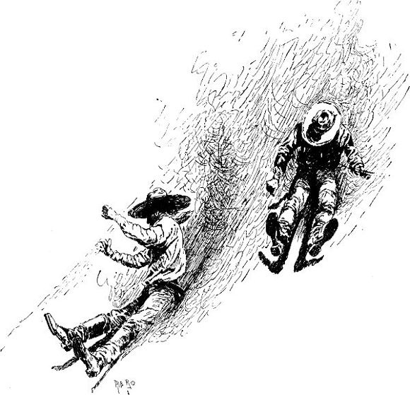 Ich schwebte noch in der Luft, als jemand dem Gaul einen schallenden Hieb mit einem Lederriemen gab, und als ich wieder herunterkam, war der echte mexikanische Stöpsel nicht mehr da. Ein junger Kalifornier jagte ihm nach, fing ihn ein und fragte, ob er einen Ritt mit ihm machen dürfe. Ich gestattete ihm diesen Hochgenuß. Er bestieg den Echten und flog ebenfalls einmal in die Höhe, rannte ihm aber, wie er herunterkam, die Sporen in die Rippen, worauf der Gaul davonging wie ein Telegramm. Er schwebte über drei Zäune wie ein Vogel und verschwand auf der Straße nach dem Washoe-Thal.