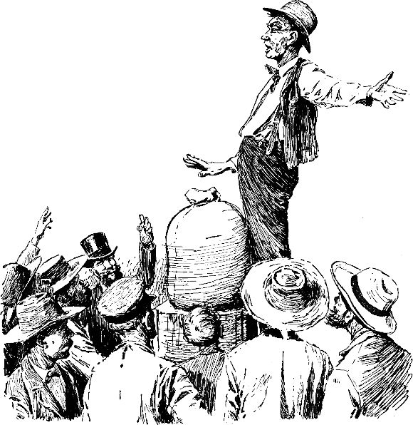 »Ich kenne dieses Pferd, – kenne es genau,« sagte er, »Sie sind ein Fremder dem Anschein nach, und so können Sie vielleicht meinen, es sei ein amerikanisches Pferd, aber ich versichere Sie, das ist nicht der Fall. Es ist durchaus nichts dergleichen; es ist – entschuldigen Sie, wenn ich leise spreche, es sind noch mehr Leute um den Weg – es ist ohne den allermindesten Zweifel ein echter mexikanischer Stöpsel!« Ich wußte allerdings nicht, was ein echter mexikanischer Stöpsel war, allein es lag etwas so Besonderes in der Art, wie der Mann das sagte, daß ich mir im stillen gelobte, ich müsse einen echten mexikanischen Stöpsel haben, und sollte es mein Leben gelten. »Hat es sonst noch Vorzüge?« forschte ich mit unsicherer Stimme, indem ich meine Ungeduld nach Kräften zu bemeistern suchte.