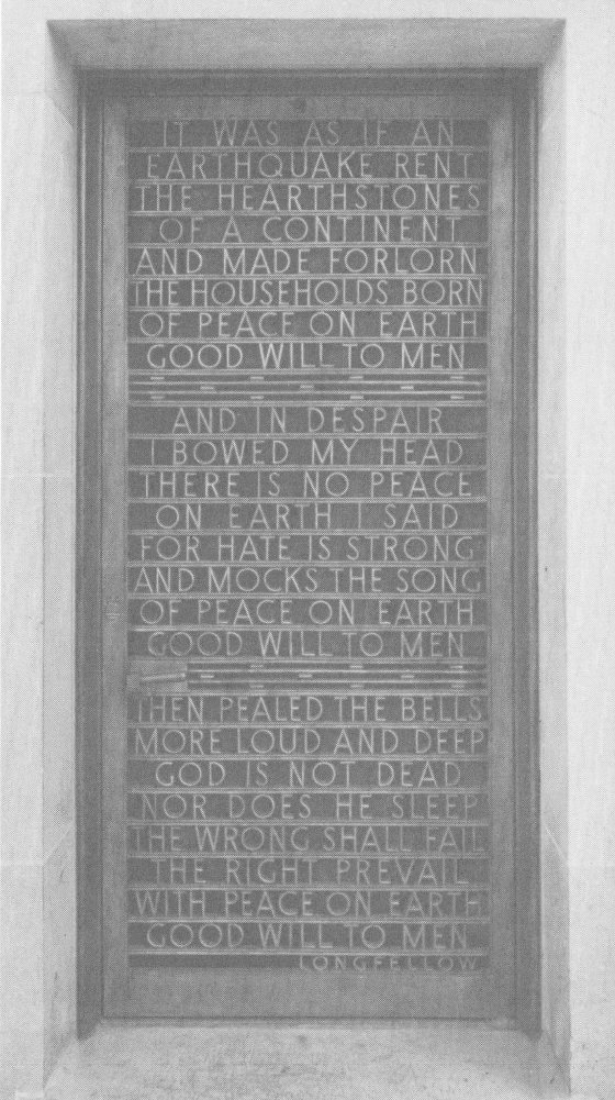 The beautiful bronze door at the Carillon is more than an entranceway. In the cherished words of Longfellow’s “Christmas Bells” it expresses the spirit in which the Carillon was conceived and dedicated to the service of the people ... “With Peace on Earth, good will to men.”