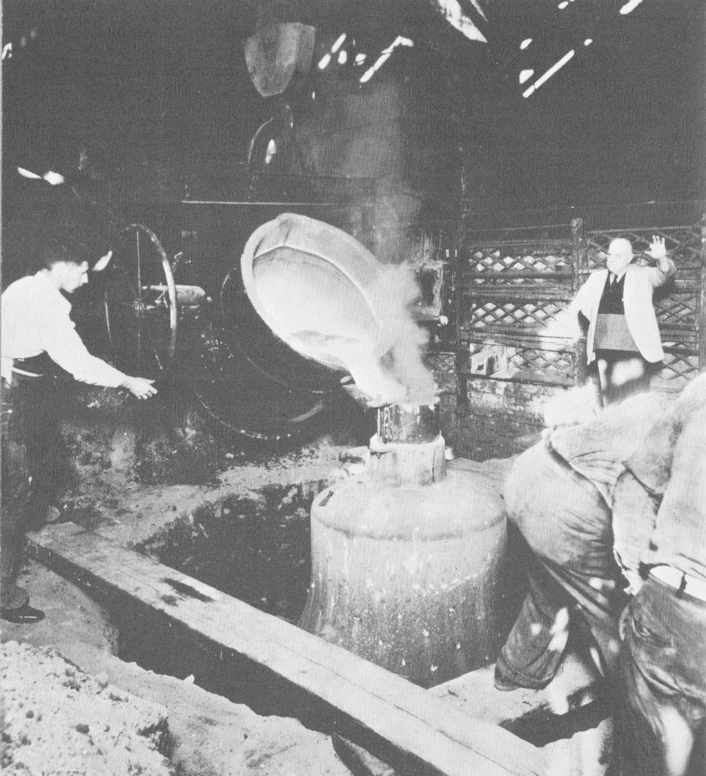 A most spectacular step in bell-making comes when the copper and tin are melted and mixed in the oil furnace, brought to just the proper temperature, and then carried in a huge ladle from which the molten alloy is poured into the mold.