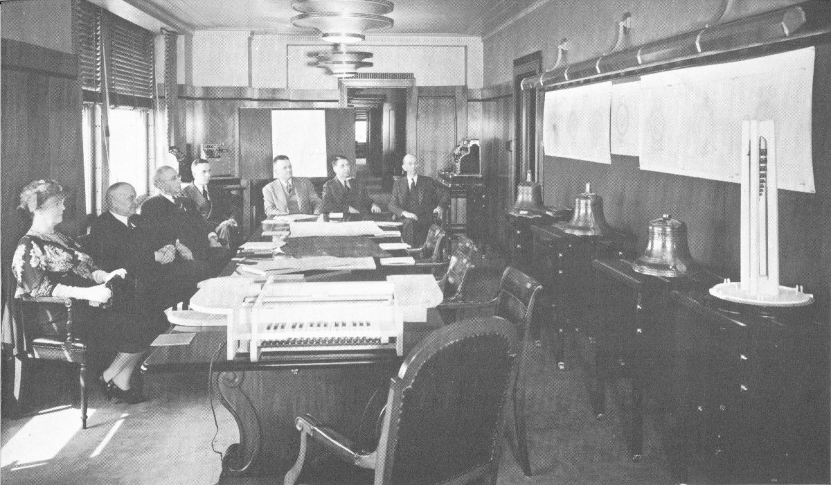 The Meneely Bell Company foundry represented a curious mixture of the old and the new. There was the main foundry with its large modern oil melting furnaces in which was blended the age-old mixture of copper and tin which is known in the textbooks as “bell metal”.... Out in the next shop were the blacksmith and his helper, skillfully working iron into the special bell mountings. Immediately behind this was the 13 finishing room where large and small bells were cleaned and buffed, while finished ones were being set into their mountings for final tests before shipment. Upstairs, patterns and cabinets were fashioned from wood; while on a nearby drafting board a chime would take form as it would fit into its final position in the tower.