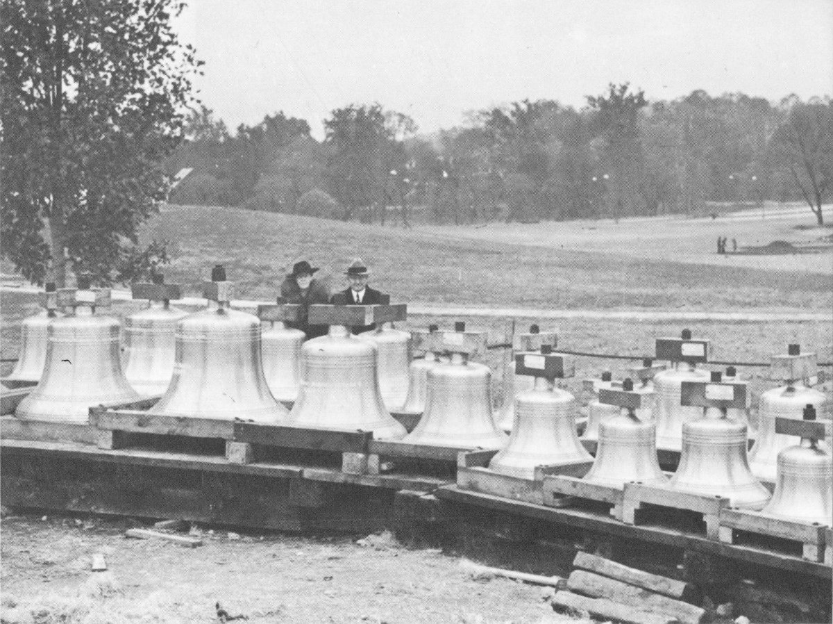 The impressive array of the 32 bells in the Carillon arranged at its base just previous to being placed in position.