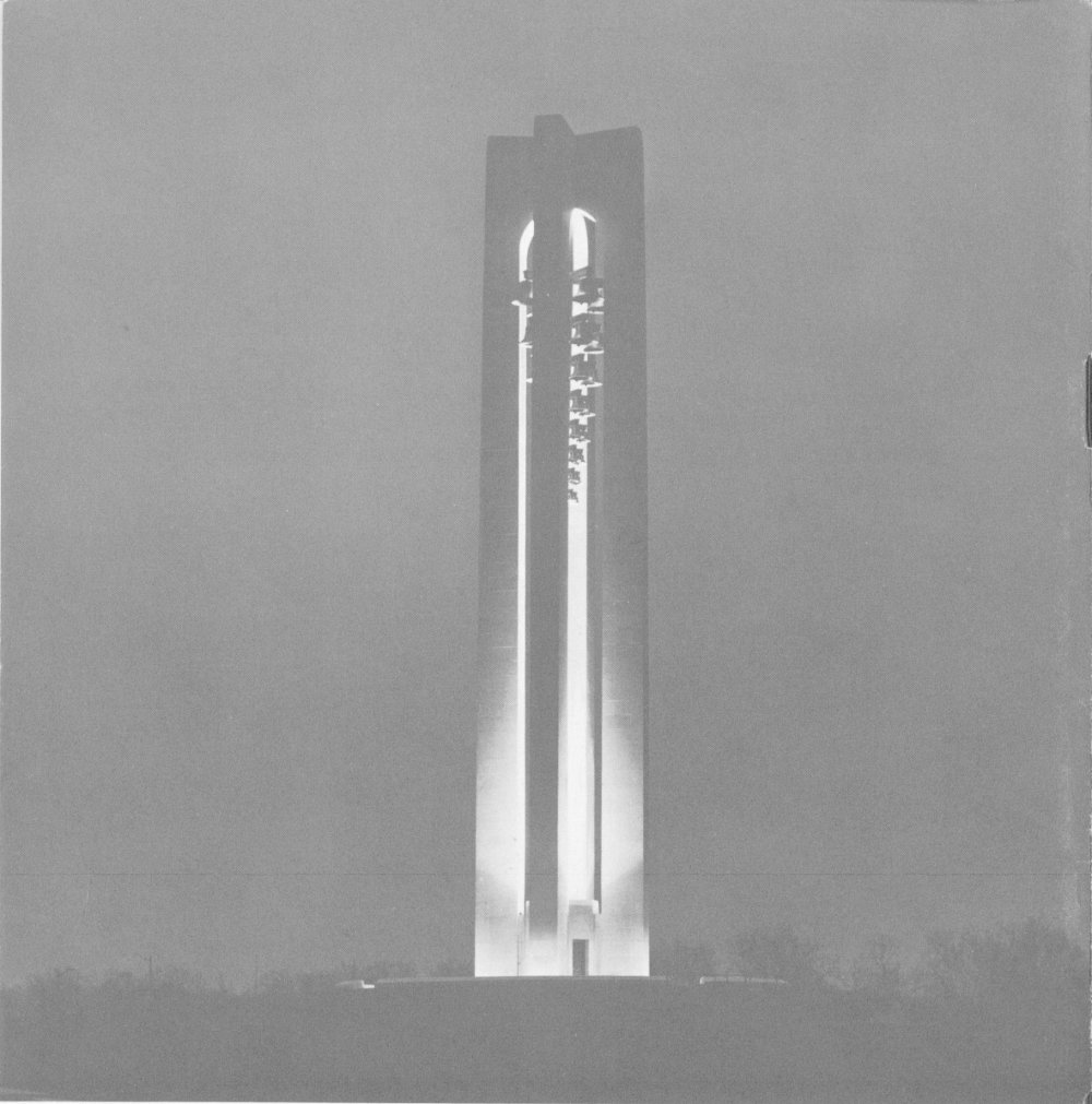 The Deeds Carillon is no less impressive by night than by day. Softly lighted, it reaches skyward, symbolic in its strength and simplicity of the spirit of the people to whom it is dedicated.