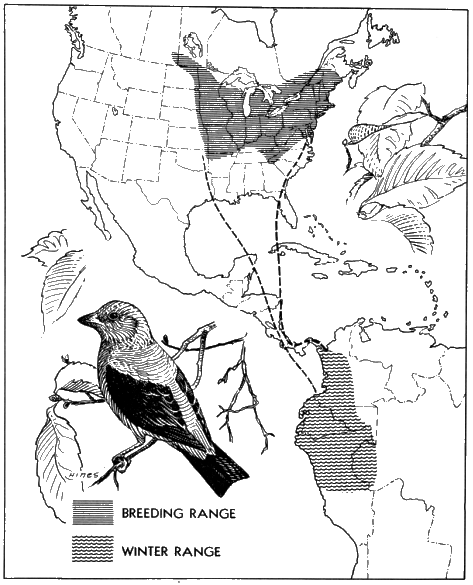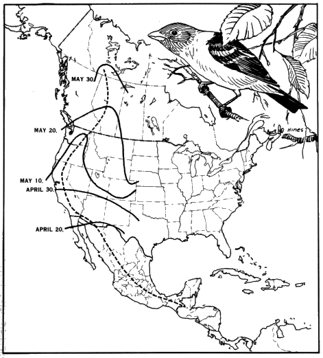 The opposing theory is simpler in some respects and supposes that the ancestral home of all birds was in the Tropics and that, as all bird life tends to overpopulation, there was a constant effort to seek breeding grounds where the competition would be less keen. Species that strove for more northern latitudes were kept in check by the ice and were forced to return southward with the recurrence of winter conditions. Gradually, as the ice retreated, vast areas of virgin country became successively suitable for summer occupancy, but the winter habitat remained the home to which the birds returned after the nesting -9- season. It is a fact that some species spend very little time on their breeding grounds; the orchard oriole, for example, spends only 2½ months in its summer home, arriving in southern Pennsylvania about the first week in May and leaving by the middle of July.