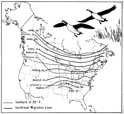 Throughout the ages the return flights of migratory birds have been important as a source of food after a lean winter and as the harbinger of a change in season. The arrival of certain species has been heralded with appropriate ceremonies in many lands, and among the Eskimos and other tribes the phenomenon to this day is the accepted sign of the imminence of spring and of warmer weather. The pioneer fur traders in Alaska and Canada offered rewards to the Indian or Eskimo who saw the first goose of the spring, and all joined in jubilant welcome to the newcomer.