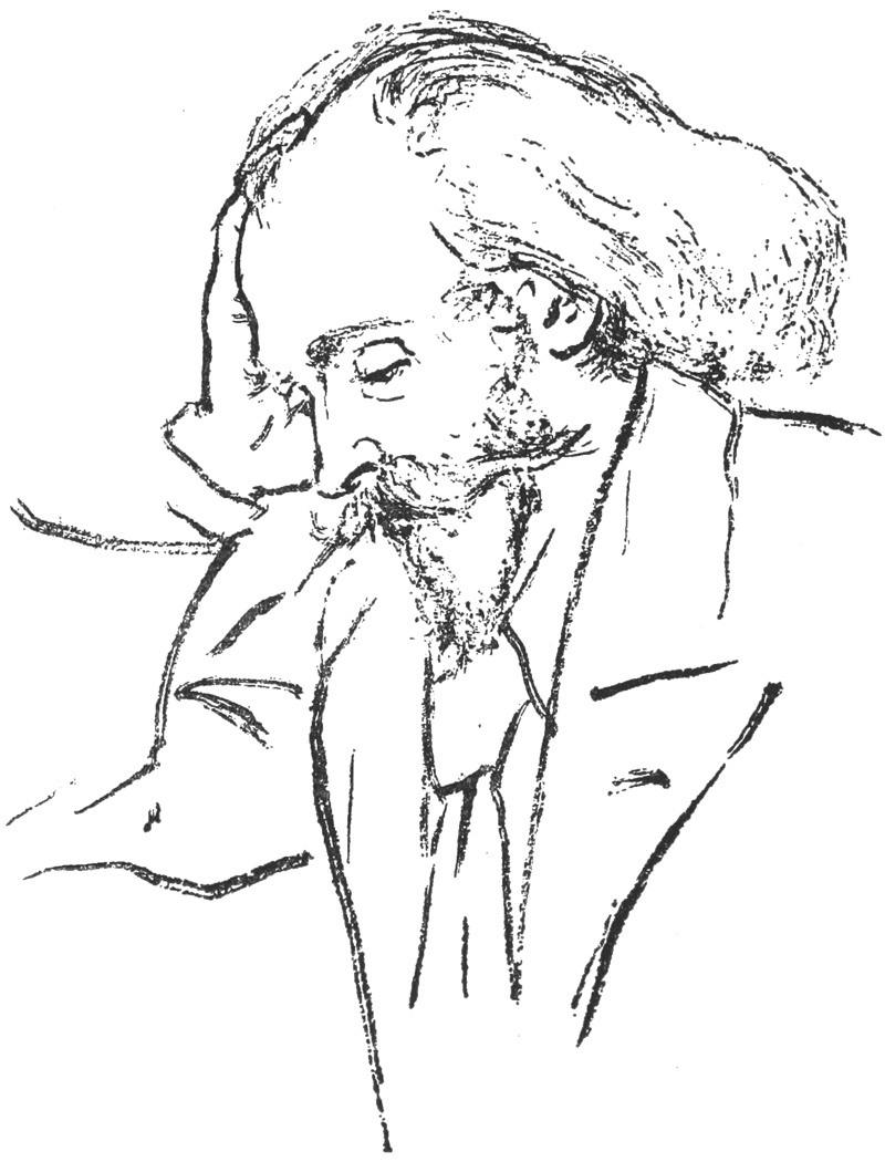 Many artists used to come to Addison Mansions. West Kensington is not like St. John’s Wood or Chelsea; there was no West Kensington Arts’ Club, and artists had not many meeting-places except Phil May’s studio and our flat. Solomon, already nearing his zenith, used often to come with his brother Albert, and so did Arthur Hacker, though they both lived some way off. We were asked to Solomon’s wedding—we and Henry Arthur Jones, I think, were the only Gentiles present at this splendid ceremony, carried out with all the historical rites. Albert Solomon very good-naturedly sat with us to tell us the significance of everything. It was as interesting as an Easter service in a Sicilian cathedral.