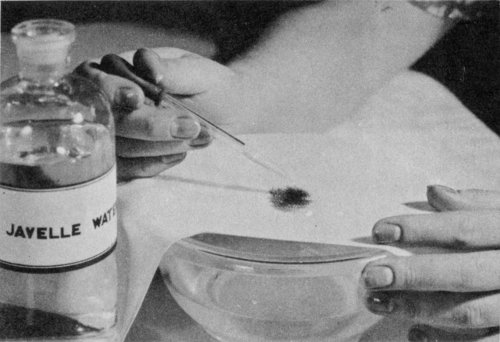 Use Javelle water to bleach stains from uncolored cotton or linen. Apply with a medicine dropper; rinse quickly in water. Apply a few drops of “hypo,” vinegar, or oxalic acid to stop the action of the chlorine.