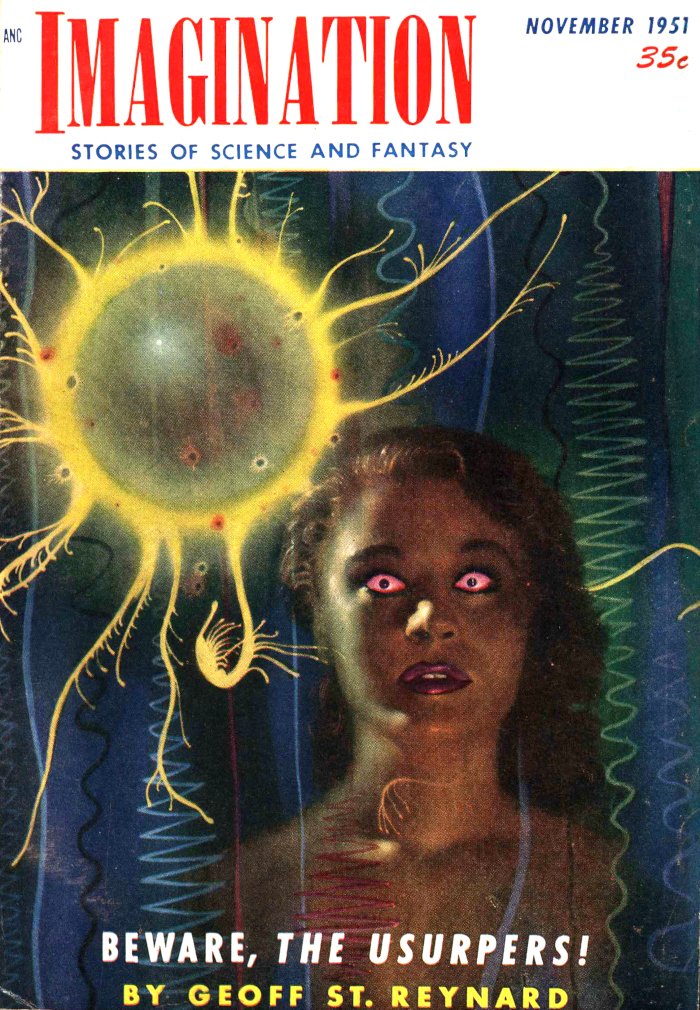 "It damned well does. It's given us so much pause—the six of us—that we've decided to devote our lives to fighting the usurpers. That's why we're doing this huggermugger business, Johnson. We're duplicating Jerry Wolfe's experience, trying to get our eyesight warped or marred or shifted, or whatever the phrase ought to be, as his was. So we can see 'em, and combat 'em, and send 'em home to their silver-lined wastelands."